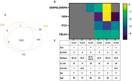 DM served as a disease control to exclude proteins shared with DM and to determine CLE-specific EV cargo. Proteomic analysis identified an average of 975.9 proteins in DM, 1041.1 in CLE, and 1052.8 in HCs. There was no significant difference in the number of proteins between the three groups (p = 0.8). A total of 1419 proteins were identified. Of these there were 4 CLE cohort specific proteins, 67 DM-specific proteins, and 7 proteins in both CLE and DM patients but not HCs. HCs had no unique proteins (Figure 2A). The four unique CLE proteins were SNRPB/SNRPN (small nuclear ribonucleoprotein-associated proteins B and B’/small nuclear ribonucleoprotein-associated protein N), OGN (mimecan), IFI27 (interferon alpha-inducible protein 27), and FBLN2 (fibulin-2). Protein expressions of OGN, IFI27, and FBLN2 were detected only in higher-score SLEDAI patients (CLE5, CLE6), but not in those with lower SLEDAI scores (CLE1, CLE2, CLE3) (Figure 2B,C). Small nuclear ribonucleoprotein-associated proteins B and B’ and small nuclear ribonucleoprotein-associated protein N are also known as Sm-B/B’ and Sm-D, both part of anti-Sm antigens. SNRPB and SNRPN proteins were detected in 3/6 CLE patients, and 2 were positive for anti-Sm antibodies (Figure 2B,C).