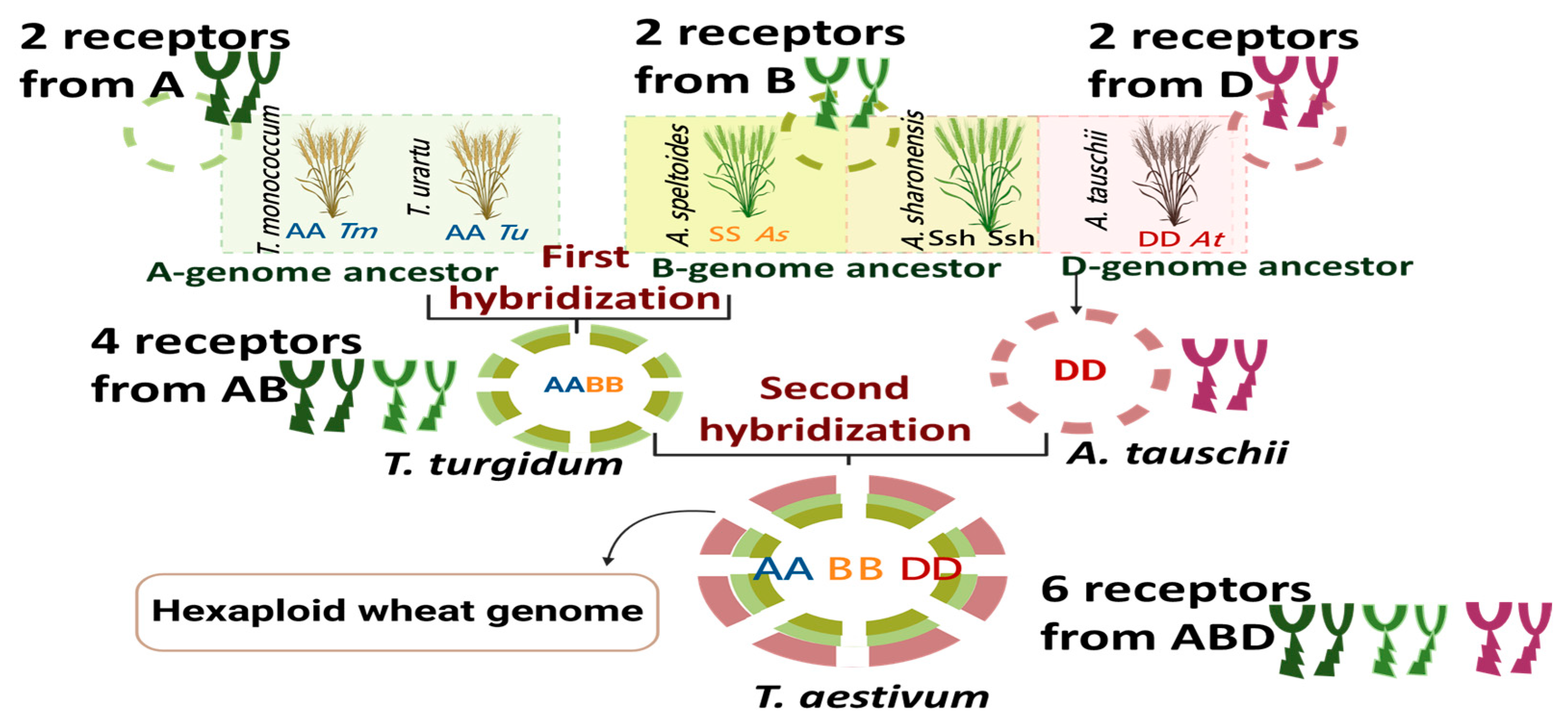 Figure 1. Evolutionary origin of hexaploid bread wheat (T. aestivum, AABBDD) leading to an increase in the number of receptors. The A-genome ancestor (T. urartu) hybridized with a species related to the B-genome donor (A. speltoides or its close relatives such as A. sharonensis), giving rise to tetraploid wheat (AABB). A subsequent hybridisation event between tetraploid wheat and the D-genome ancestor (A. tauschii) resulted in the formation of hexaploid bread wheat (AABBDD).