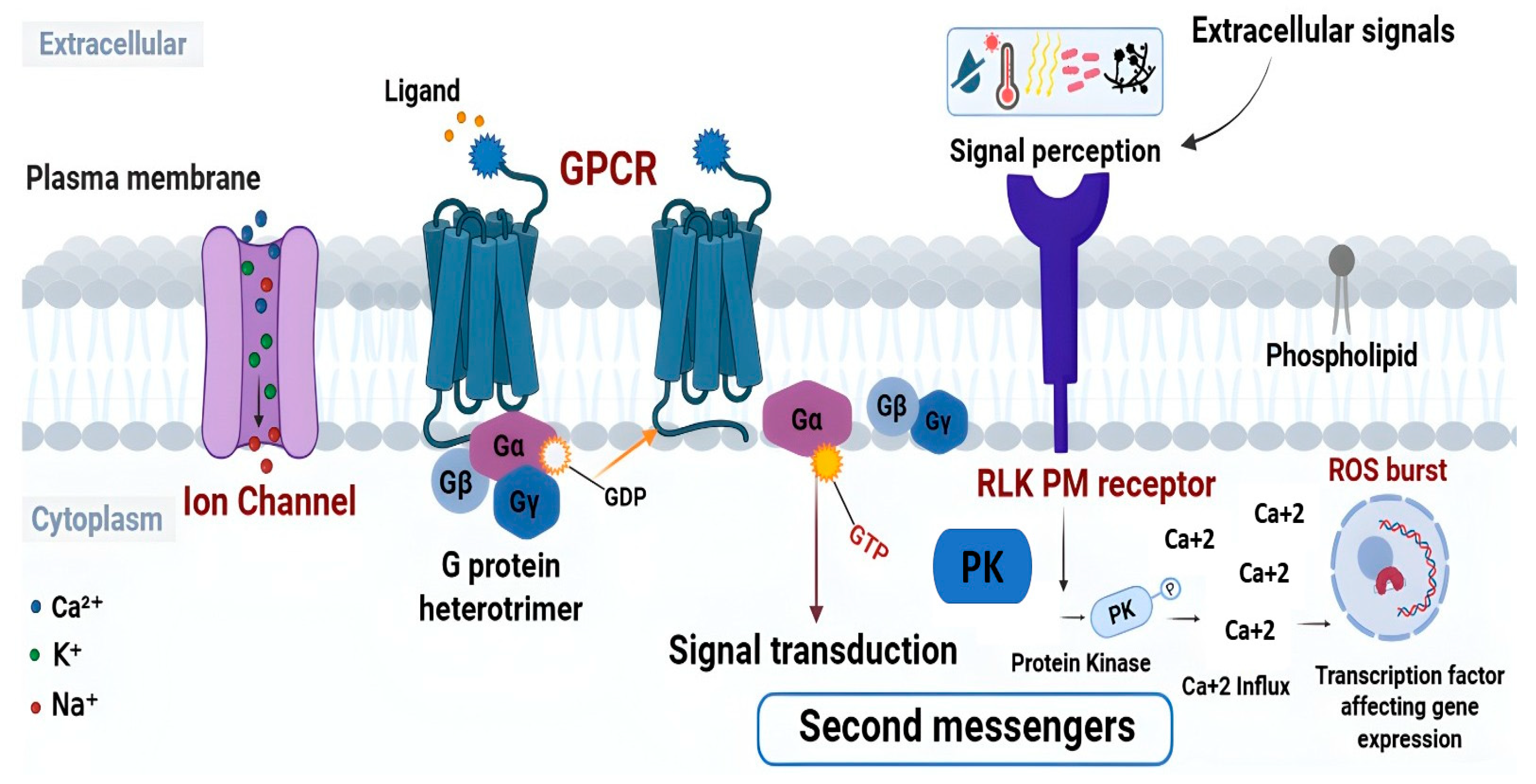 Figure 2. Schematic overview of plasma membrane–mediated signal perception and transduction in plant immunity. Components of plasma membrane signaling pathways involved in perceiving extracellular cues. Ion channels regulate the movement of Ca2+, K+, and Na+ across the membrane, GPCRs, heterotrimeric G-proteins, and PM-RLKs relay signals upon ligand perception and activate downstream second messengers.