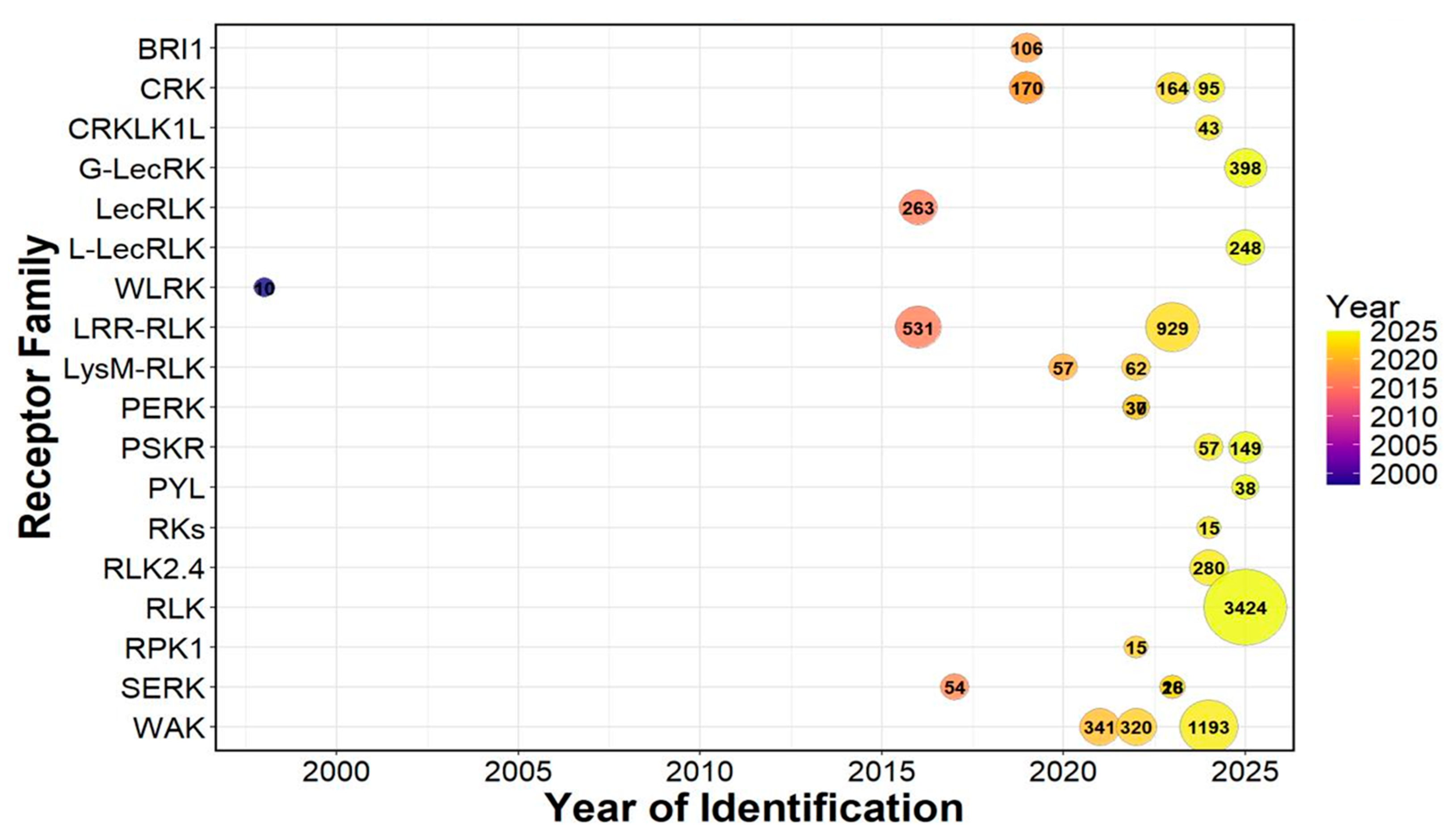 Over the past three decades, substantial efforts have been dedicated to identifying and characterizing wheat PMRs. The first family to be identified was the wheat leaf rust kinase family, WLRK, described by Feuillet et al. [73]. This family consisted of 10 members that were assigned to specific chromosomes and conferred disease resistance. Subsequent studies, enabled by the high-quality IWGSC wheat genome sequence, have achieved a more comprehensive identification and characterization of the PMR families. The extensive expansion observed across PMR families is strongly influenced by wheat’s allohexaploid genome structure, which promotes the retention of homeologous RLKs across the A, B, and D subgenomes and enables subfunctionalization, thereby increasing receptor diversification and flexibility in immune responses [126]. Since then, numerous RLK families have been reported, with member numbers varying across studies due to improvements in genome assembly, annotation pipelines, and experimental objectives (Figure 4). Among these, the LRR-RLK family represents one of the largest, with 531 members initially identified [127] and later expanded to 929 members in a more recent study [42]. Similarly, a global analysis of the general RLK gene repertoire identified more than 3424 RLK genes in wheat [126], highlighting the extraordinary expansion of this gene family in polyploid cereals. This large-scale expansion aligns with widespread gene duplication and retention events that have enhanced the structural and functional diversity of receptor families across the wheat genome.