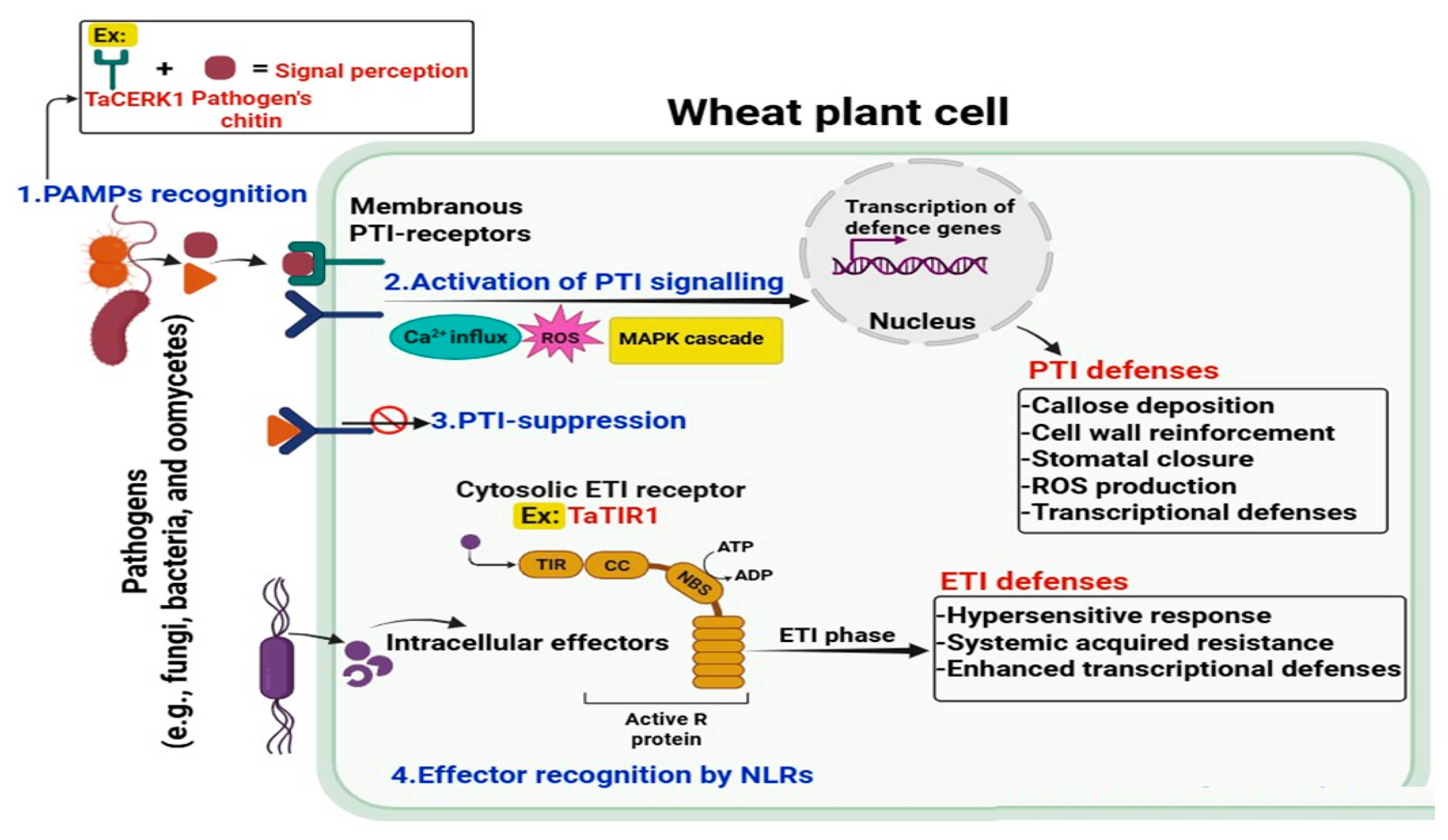 Figure 5. Overview of PTI and ETI defense mechanisms in wheat plant cells. The diagram illustrates the two-tiered immune system of wheat in response to pathogen attack. First, PAMPs are recognized by PMRs like TaCERK1 on the plasma membrane, initiating PTI. Second, PTI activation involves Ca2+ influx, ROS production, and MAPK cascade signaling, leading to transcriptional activation of defense genes and PTI defenses, including callose deposition, cell wall reinforcement, stomatal closure, ROS accumulation, and transcriptional defenses. Third, some pathogens deliver effectors to suppress PTI responses.