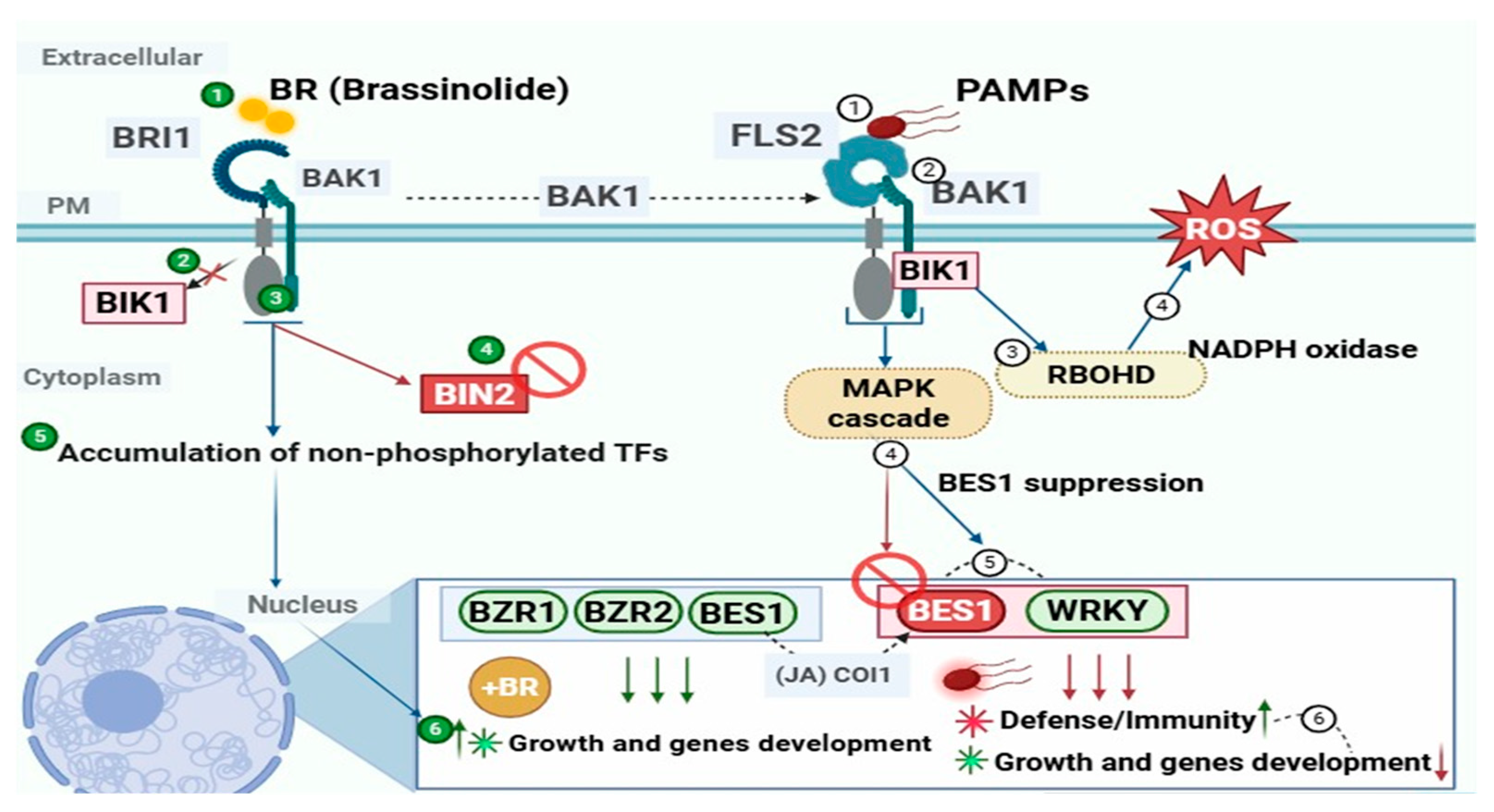 Figure 6. Crosstalk between brassinosteroid signaling and PTI pathways in plants. Brassinolide binds to its receptor BRI1, which forms a complex with BAK1, leading to the activation of downstream signaling. This interaction inhibits BIN2, promoting the accumulation of non-phosphorylated transcription factors (TFs) such as BZR1, BZR2, and BES1, which regulate genes involved in plant growth and development.