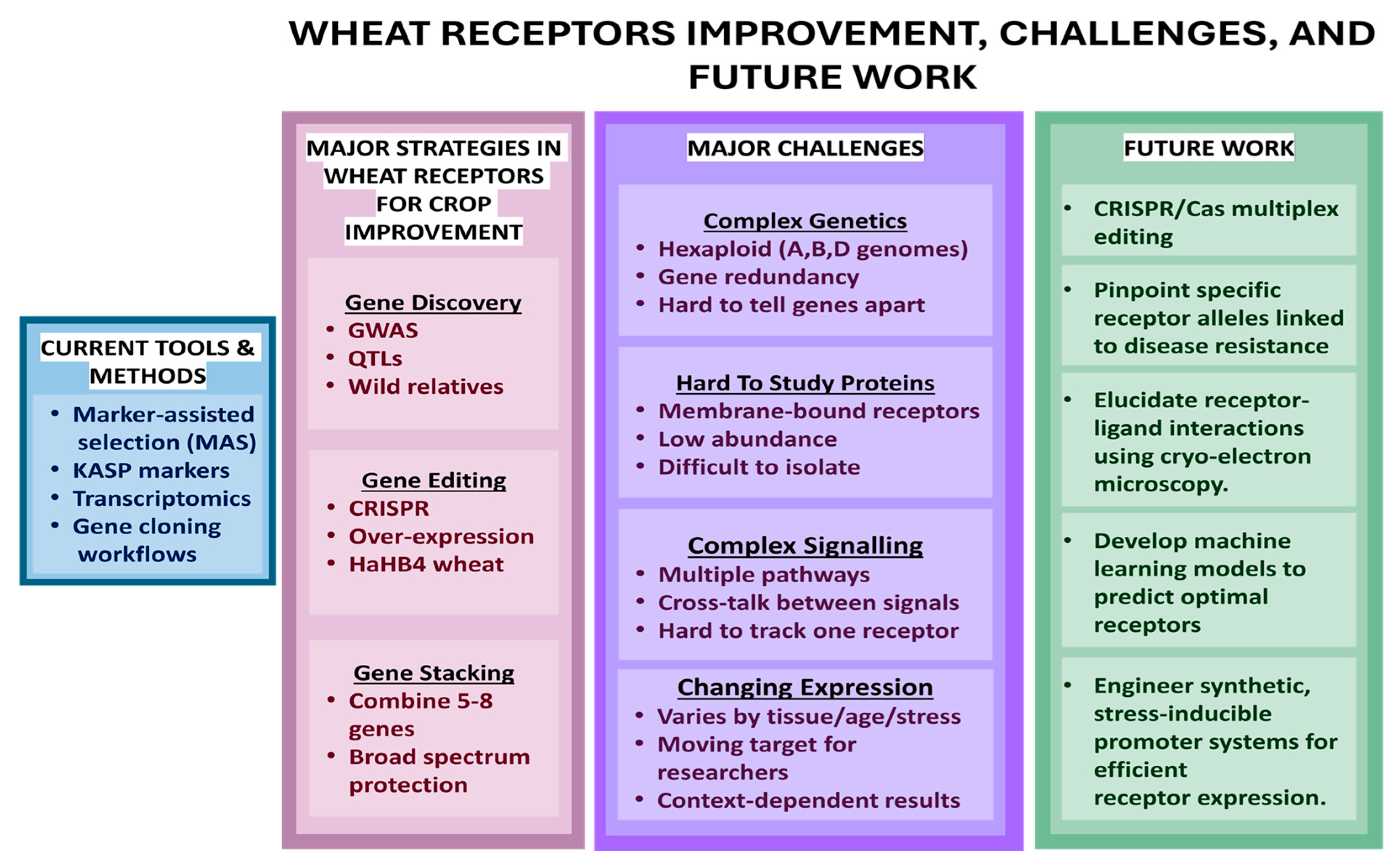 Figure 7. Overview of strategies, challenges, and future directions in wheat receptor research for crop improvement. The diagram summarizes the current tools and methodologies used in wheat receptor studies.