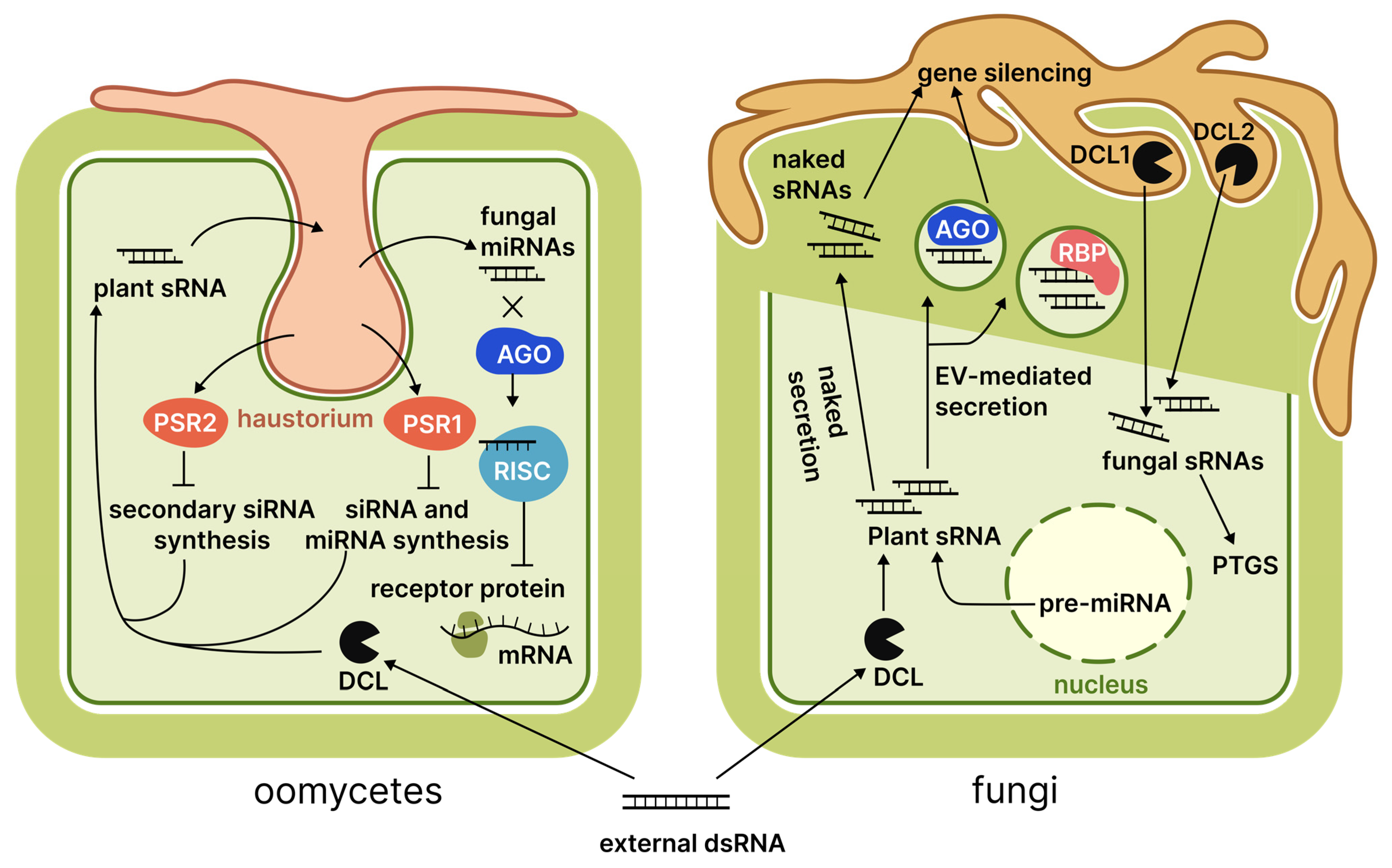 - Weiberg, A.; Wang, M.; Lin, F.M.; Zhao, H.; Zhang, Z.; Kaloshian, I.; Huang, H.D.; Jin, H. Fungal small RNAs suppress plant immunity by hijacking host RNA interference pathways. Science 2013, 342, 118–123, Erratum in Science 2025, 389, eaec0182. [Google Scholar] [CrossRef]