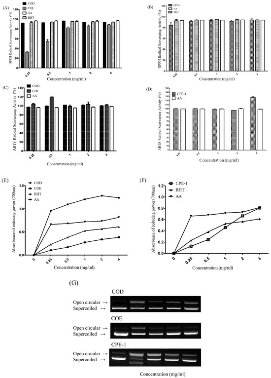 6X loading and plasmid DNA, specifically pBR322, was purchased from Thermo Scientific. According to a previous study, the COD, COE, and CPE-1’s capacity to stop hydrogen peroxide-induced DNA damage was examined [26]. Three millilitres of 30% hydrogen peroxide (H2O2) (v/v), five millilitres of D.W., two millilitres of 0.08 mM iron(II) sulphate heptahydrate (FeSO4), and two millilitres of both extracts at different concentrations (0.25, 0.5, and 1 mg/mL) were combined with pBR322 (1 µL, 0.5 µg/µL). Two microliters of 6X loading dye were then added to the mixture, and it was incubated for an hour at 37 °C. The combination was electrophoresed using a 0.8% agarose gel (Mupid-2plus; Advance Co., Ltd., Osaka, Japan) at room temperature (100 V). Ethidium bromide (EtBr) was used to stain DNA (deoxyribonucleic acid) bands, including supercoiled, linear, and open circular, and the gels were then scanned using the ChemiDoc MP Imaging System (BIO RAD, Hercules, CA, USA).