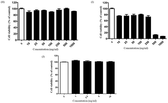 DNA protection assays (Figure 2G) revealed that none of the extracts, including CPE-1, caused detectable DNA damage, as indicated by the preservation of supercoiled and open circular plasmid forms. Furthermore, MTT assays were conducted to assess the cytotoxicity of the extracts (Figure 2H–J). COD, COE, and CPE-1 exhibited low cytotoxicity across the tested concentration range, indicating high biocompatibility. However, CPE-1 displayed a mild dose-dependent cytotoxic effect, suggesting enhanced biological activity after bioconversion with Phellinus linteus mycelium.