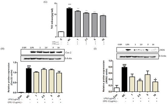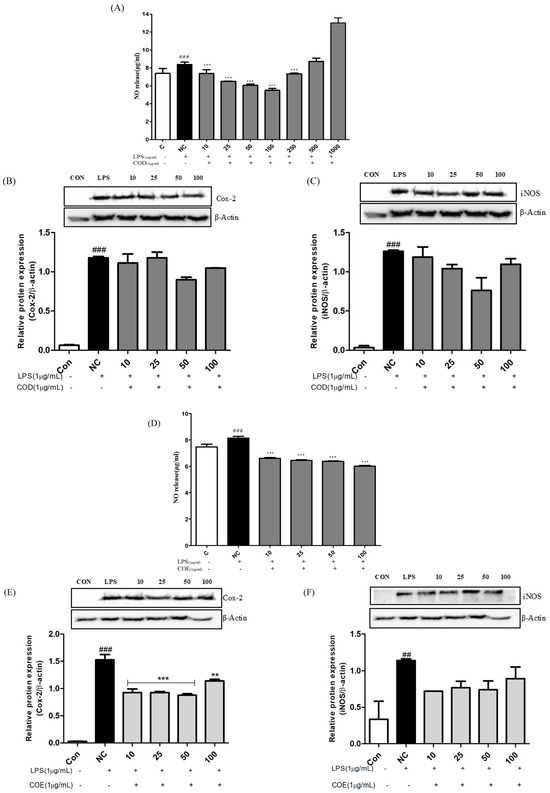RAW 264.7 cells in DMEM were seeded as 1.5 × 106 cells/well a 100 mm dish were incubated for 24 h at 37 °C in a CO2 incubator. Then, COD and COE (10, 25, 50, 100) μg/mL were treated, respectively, and cells were treated with LPS (1 μg/mL), and then cultured for 24 h. In the case of CPE-1, (1, 2.5, 5) μg/mL was treated, and the experiment was carried out. Next, total protein was extracted using PRO-PREP buffer purchased by iNtRON Biotechnology and the protein was separated from the cell lysate by centrifugation at 14,000 rpm at 4 °C [29,30]. An equal amount of protein (20 μg/lane) was subjected to a 12% SDS polyacrylamide gel. After electrophoresis, protein samples were transferred into a PVDF (Polyvinylidene fluoride) membrane and blocked with 5% Bovine Serum Albumin (BSA). The membranes were incubated with corresponding primary antibodies at 4 °C over-night, then the membranes were incubated with secondary antibody(anti-rabbit) at room temperature for 1 h. Then, the immunosignals in membranes were visualised by ECL kit (enhanced chemiluminescence) in ChemiDoc MP Imaging System (BIO RAD). The band intensity was quantified by ImageJ software (version 1.54).