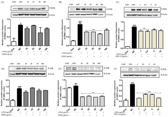 The MAPK signalling cascade is a key mediator of inflammatory responses in macrophages exposed to LPS stimulation. To further elucidate the molecular mechanism underlying the anti-inflammatory effects of Chamaecyparis obtusa–derived extracts, the effects of COD, COE, and CPE-1 on MAPK pathway activation were examined in LPS-stimulated RAW 264.7 cells. As shown in Figure 4, LPS treatment markedly enhanced the phosphorylation of ERK and JNK, confirming robust MAPK activation under inflammatory conditions. In contrast, treatment with all three extracts significantly attenuated this phosphorylation in a concentration-dependent manner (*** p < 0.001 vs. LPS). Specifically, CPE-1 exhibited the most pronounced inhibitory effect on both ERK (Figure 4A–C) and JNK (Figure 4D–F) phosphorylation, while COD and COE showed moderate but dose-dependent suppression of MAPK activation.