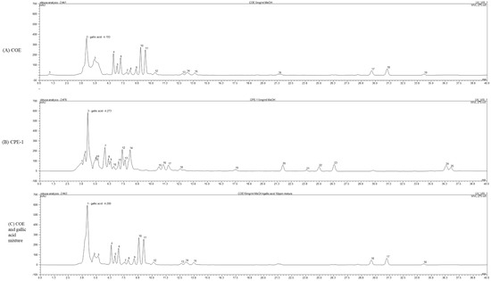The chromatographic peaks around 4.19–4.27 min in all three samples—(A) COE, (B) CPE-1—correspond to gallic acid, and (C) COE + gallic acid mixture, based on retention time alignment: (A) COE alone shows a peak at ~4.193 min. (B) COE + gallic acid mixture shows gallic acid at ~4.200 min. (C) CPE-1 (bioconverted extract) shows a peak at ~4.273 min.