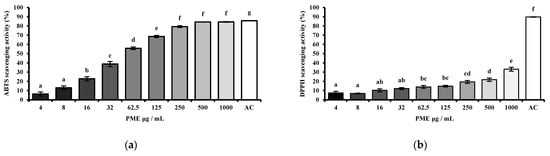 The antioxidant capacity of PME was measured in a dose-dependent manner (4, 8, 16, 32, 62.5, 125, 250, 500, 1000 μg/mL). The radical scavenging activity of the PME was assessed using the 2,2′-azino-bis (3-ethylbenzothiazoline-6-sulfonic acid) (ABTS) (Sigma-Aldrich, St. Louis, MO, USA) assay and the 2,2-diphenyl-1-picrylhydrazyl (DPPH) (Sigma-Aldrich, St. Louis, MO, USA) assay, as previously described by Lee et al. [
