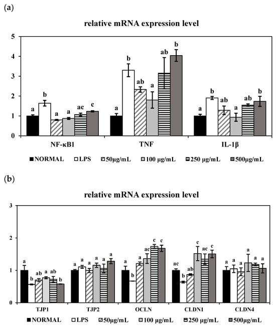 Moreover, another set was conducted to confirm the proper lipopolysaccharide dosage. The HT-29 cells were treated with LPS (Escherichia coli strain 0111:B4; Sigma-Aldrich, St. Louis, MO, USA) in a dose-dependent manner (0, 1, 3, 5, 10, 20, 50, 100 μg/mL) for 24 h. The procedure was then carried out as described above.