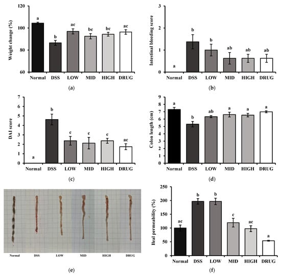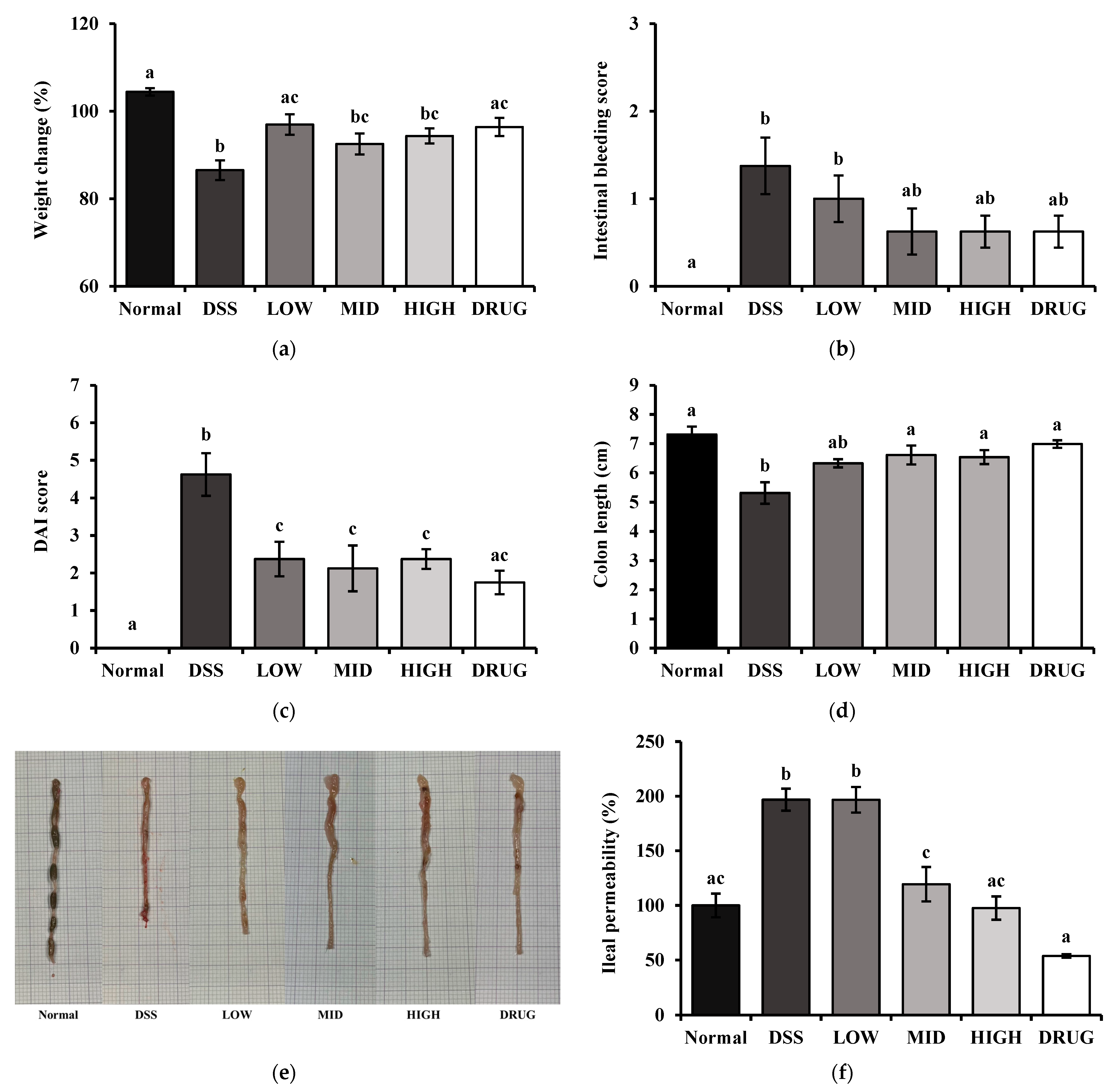 39]. In the present study, mice exposed to DSS exhibited significant reductions in body weight and increased intestinal bleeding, leading to elevated disease activity index (DAI) scores, consistent with previously reported colitis models [