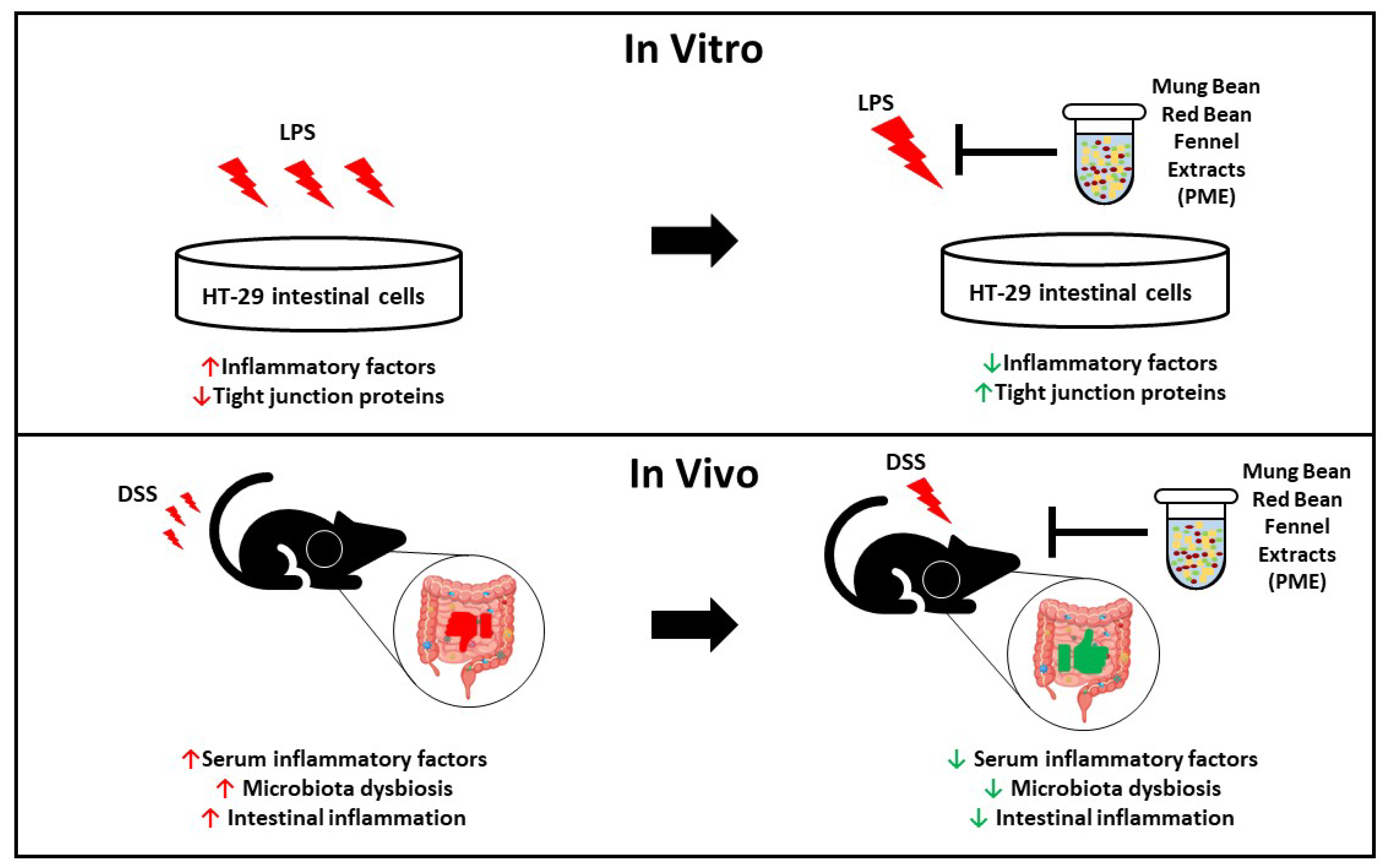 19]. These biological properties suggest that vitexin may be one of the bioactive constituents contributing to the gut-protective effects previously reported for mung bean, red bean, and fennel. Guided by this evidence, we formulated the hypothesis that a blend of these plant-based materials would enhance intestinal barrier function. Therefore, this study aimed to evaluate the intestinal protective effects of a hot-water extract mixture prepared from mung bean, red bean, and fennel in LPS-stimulated HT-29 cells and in a DSS-induced colitis mouse model.