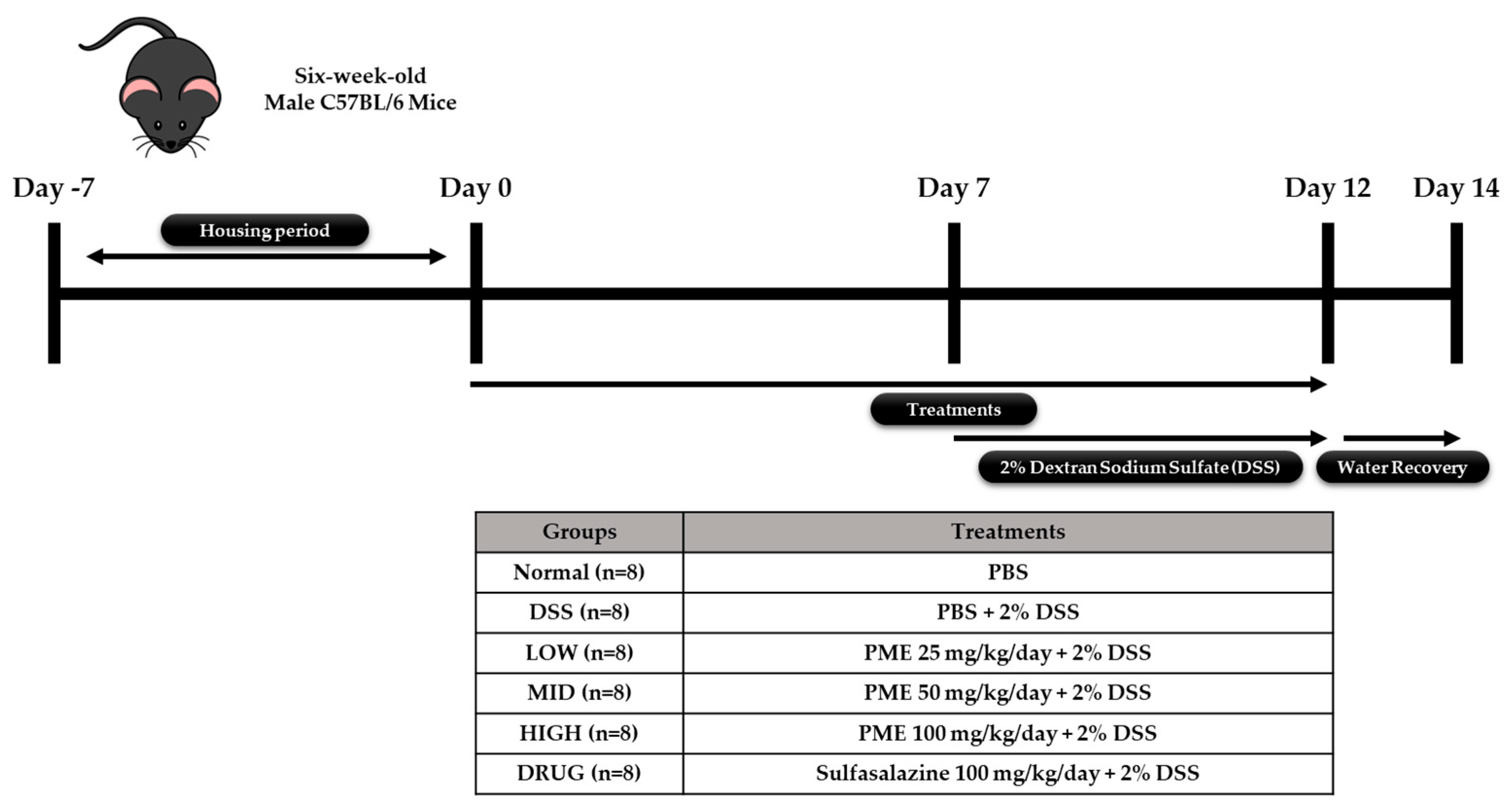 n = 8): Group 1, no treatment (Normal); Group 2, colitis-induced mice (DSS); Group 3, colitis-induced mice + PME 25 mg/kg/day (LOW); Group 4, colitis-induced mice + PME 50 mg/kg/day (MID); Group 5, colitis-induced mice + PME 100 mg/kg/day (HIGH); and Group 6, colitis-induced mice + sulfasalazine (DRUG). After acclimation, mice were pre-treated with sulfasalazine (100 mg/kg/day) and PME (25, 50, 100 mg/kg/day) by oral gavage for 2 weeks. Over the same period, the Normal and DSS groups were orally administered an equal volume of saline. Then, excluding the Normal group, mice were given 2% DSS (MP Biomedicals, Santa Ana, CA, USA; molecular weight 36,000–50,000 Da) in their drinking water for 5 days to induce colitis, followed by a 2-day water recovery period during the second week of treatment. The doses of PME used in the in vivo study (25, 50, and 100 mg/kg) were selected based on preliminary in vitro results. The previous HT-29 study provided insight into the concentrations at which PME exhibited biological activity without causing significant cytotoxicity. The in vitro data were used to define a dose range that would allow for the evaluation of PME’s effects across a spectrum of low to high doses. The chosen doses represent a gradient of LOW (25 mg/kg), MID (50 mg/kg), and HIGH (100 mg/kg) exposure, ensuring a comprehensive assessment of PME’s potential effects. The highest dose of 100 mg/kg was selected to ensure that PME would be administered at a level that was both biologically active and non-toxic for further in vivo assessment. Growth performance data (body weight, feed intake, and water intake) were recorded throughout the study period. The mice were anesthetized in a CO