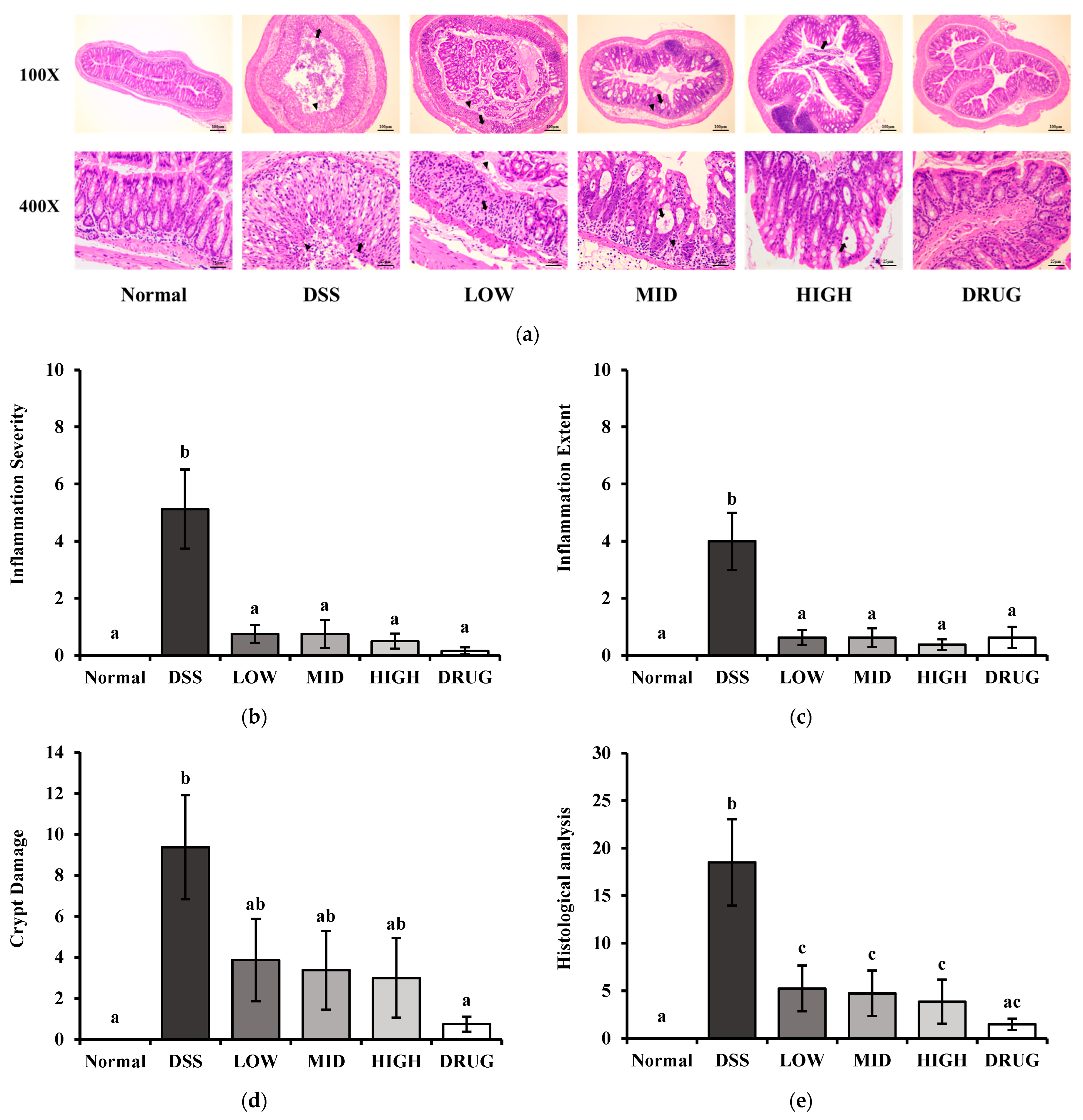 22]. The inflammation severity was scored on a scale of 0 to 3 (0, none; 1, mild; 2, moderate; 3, severe), and the extent of inflammation was scored from 0 to 3 (0, none; 1, mucosa; 2, mucosa and submucosa; 3, transmural). Crypt damage was scored from 0 to 4 according to the extent of crypt loss and epithelial erosion (0, none; 1, basal 1/3 damaged; 2, basal 2/3 damaged; 3, entire crypts lost with surface epithelium present; 4, crypts and surface epithelium completely lost). Histological analysis of H&E-stained slides and scoring were performed by Doo Yeol Biotech (Seoul, Republic of Korea).