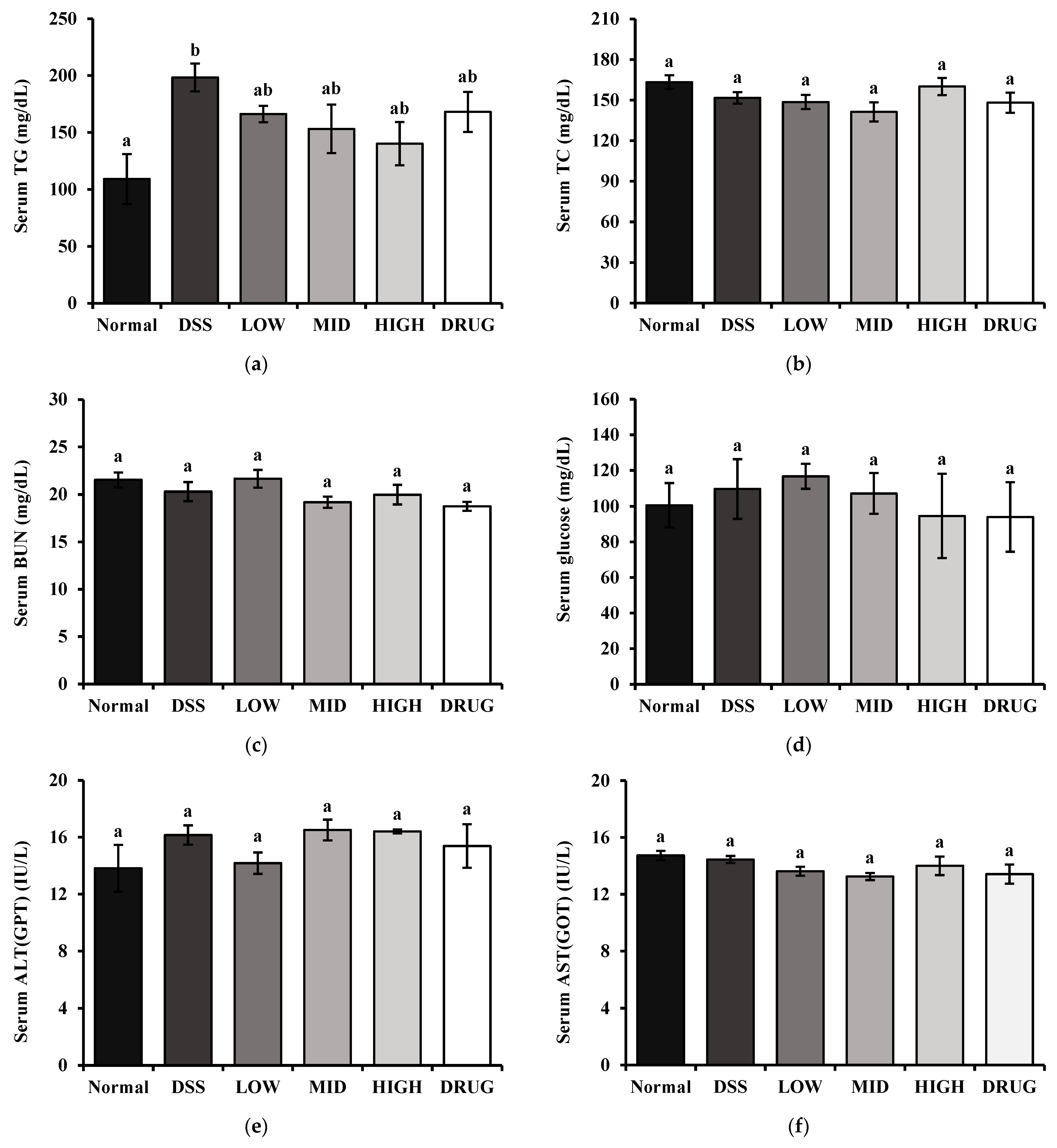 37]. However, average daily water intake (ADWI) remained unchanged across all groups, suggesting that DSS-induced systemic illness primarily affects appetite, thereby leading to decreased body weight. Moreover, to evaluate potential systemic or metabolic adverse effects of PME, we measured serum biomarkers of body metabolism, including glucose, TG, TC, BUN, AST, and ALT, in DSS-induced mice. All DSS- and PME-treated groups showed no significant differences in serum metabolic biomarker levels, except for TG. Interestingly, serum TG levels were significantly increased by DSS induction, and PME tended to normalize these elevated TG levels in a dose-dependent manner. A previous report demonstrated that hepatic TG levels were significantly increased in DSS-induced colitis mice [