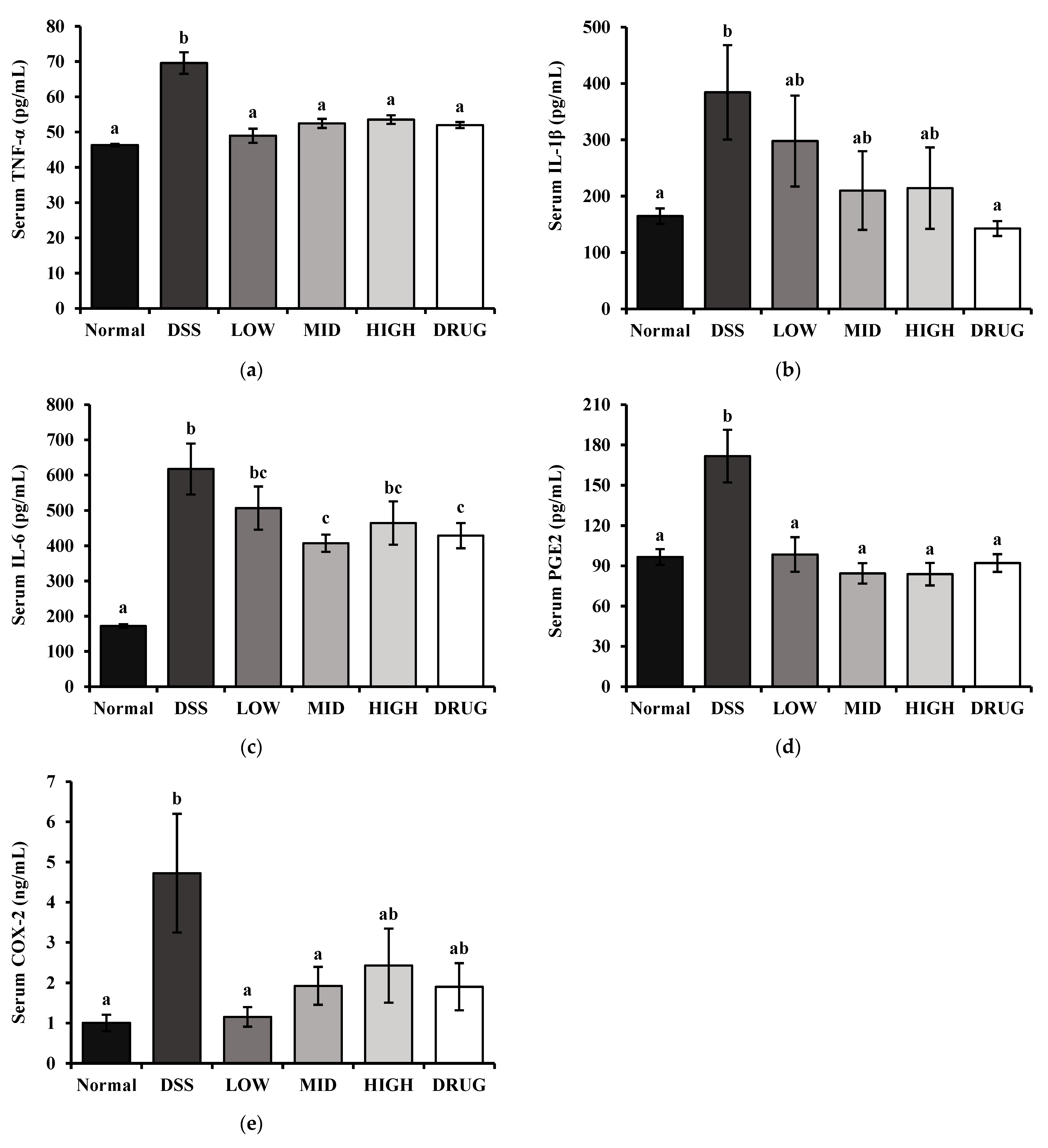 11]. Therefore, we measured these inflammatory factors in serum by ELISA to evaluate whether PME treatment modulates the systemic inflammatory response in DSS-induced colitis. Our study showed that PME treatment effectively suppressed several of these inflammatory markers. In particular, serum TNF-α levels were significantly reduced across all PME doses, highlighting PME’s anti-inflammatory potential. Meanwhile, PME administration tended to lower serum IL-1β and IL-6 levels; however, the reductions did not reach statistical significance, except for serum IL-6 in the MID group. In addition, PGE