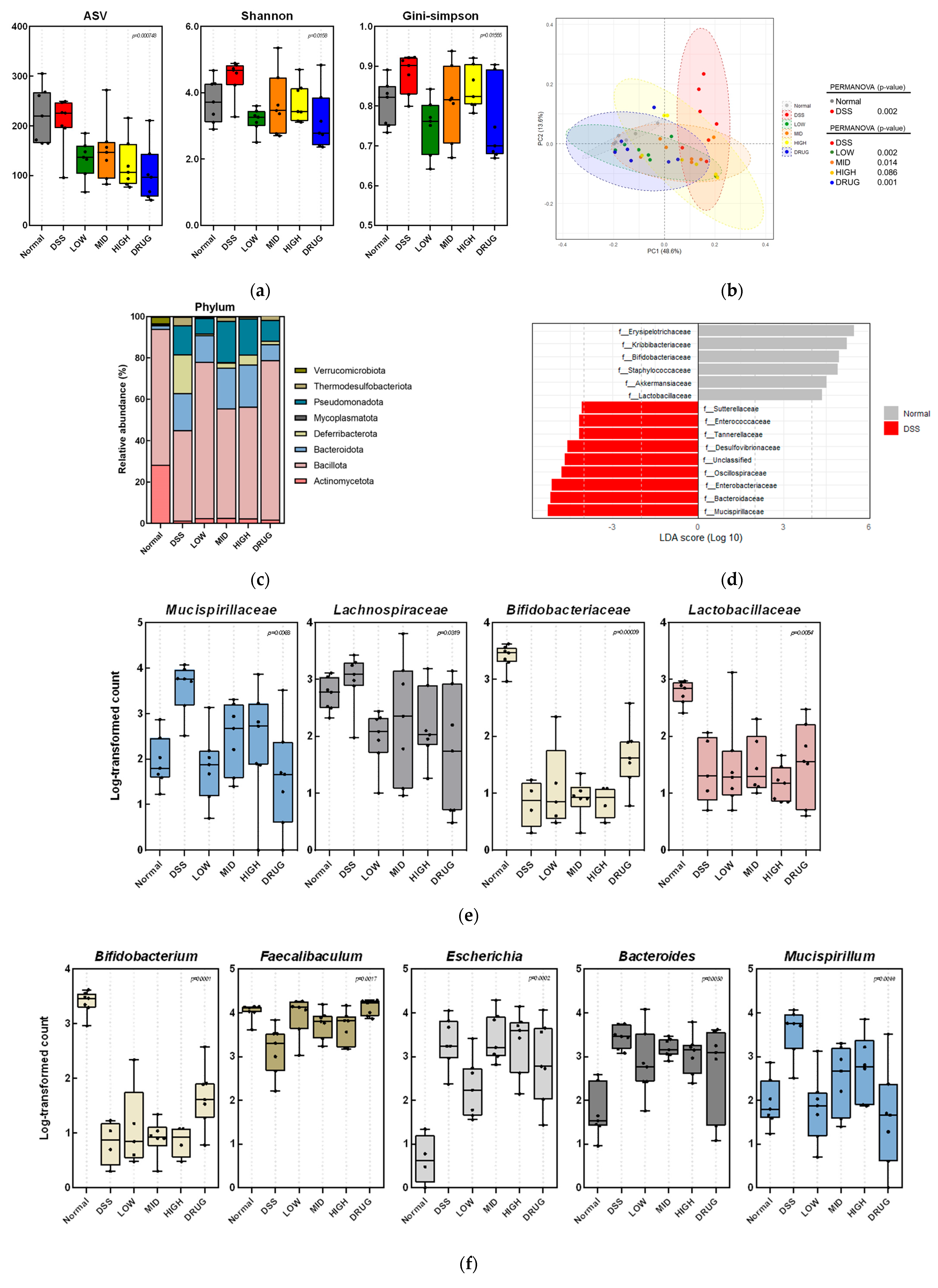 47]. Consequently, this dysregulated microbial overgrowth could manifest as an apparent increase in species richness (alpha-diversity), reflecting barrier dysfunction rather than improved microbial health. Therefore, detailed taxonomic profiling at the phylum, family, and genus levels was needed to better understand how our results differ from those of earlier studies. Next, beta-diversity analysis also revealed a distinct separation between the DSS and Normal groups, confirming that DSS-induced colitis caused a marked alteration in the overall microbial community structure. Interestingly, PME and DRUG treatments altered the microbial community toward that of the Normal group, suggesting partial recovery of the intestinal microbiota. Notably, the LOW and DRUG groups showed the greatest separation from the DSS group, suggesting a strong modulatory effect on microbial structure. This may reflect a transient expansion of opportunistic taxa under inflammatory stress rather than genuine microbial stability [
