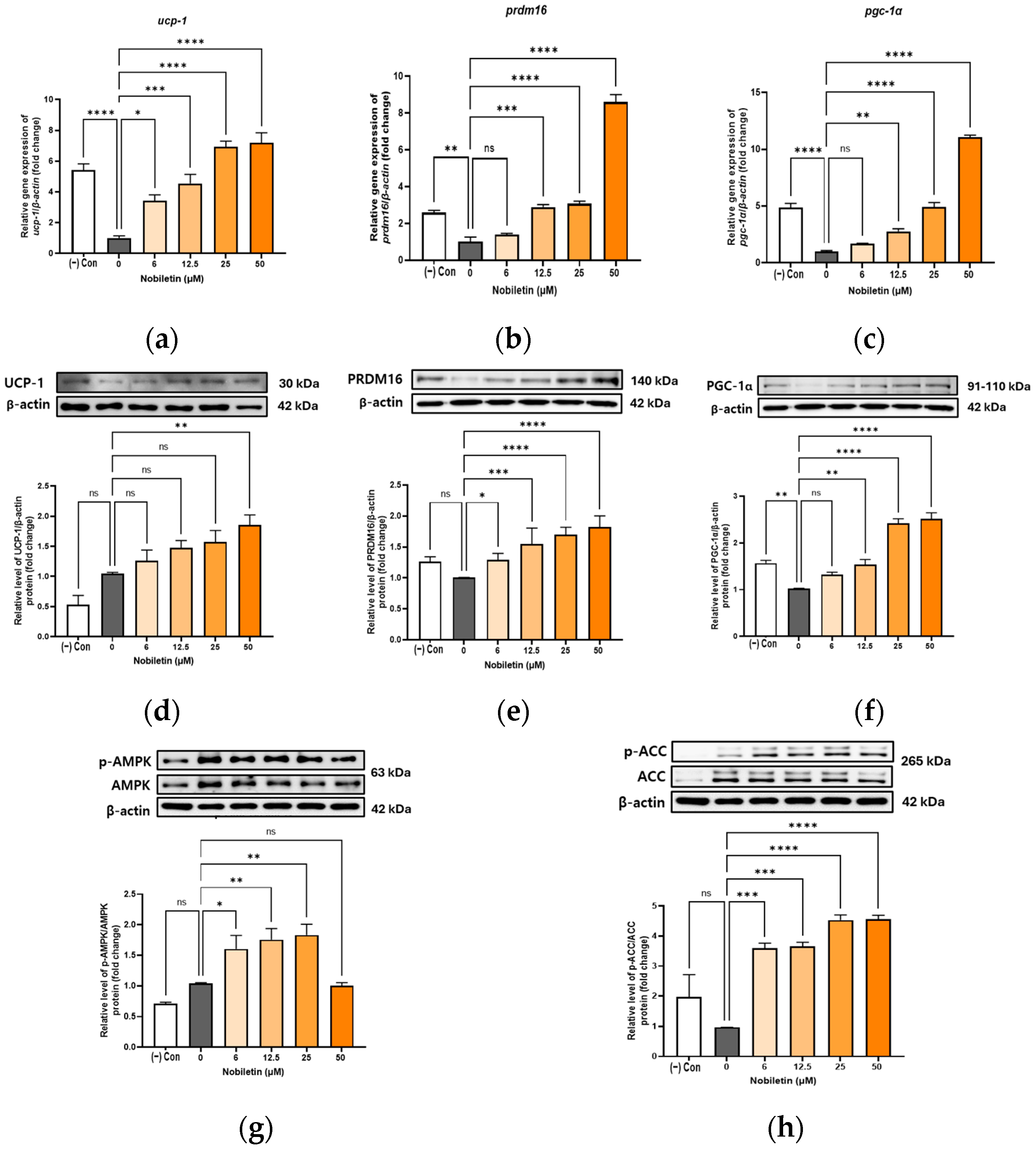 3.5. Increase in the Expression of Browning Markers in Differentiated Adipocytes 3T3-L1 in the Presence of Nobiletin