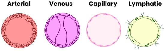 Differentiation of angioblasts into arterial or venous endothelial cells occurs prior to the formation of distinct vascular structures. Key molecular determinants include the tyrosine kinase receptor EphB4 and its ligand ephrinB2, which define venous and arterial identity, respectively. The interaction between VEGF and its receptor VEGFR2 (also known as KDR/Flk1) activates Notch signaling, inducing ephrinB2 expression in arterial endothelial progenitors. In the absence of Notch activation, endothelial cells default to a venous phenotype [12]. Table 1 and Figure 1 presents the types of endothelial cells in individual blood and lymphatic vessels [14].
