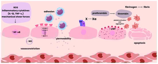 In 1998, Hunt and Jurd identified five principal mechanisms underlying endothelial cell dysfunction: (1) loss of vascular integrity, (2) increased expression of adhesion molecules, (3) acquisition of a prothrombotic phenotype, (4) cytokine production, and (5) upregulation of human leukocyte antigen (HLA) molecules. These are further influenced by the organ-specific heterogeneity of ECs under both physiological and pathological conditions [21]. In endothelial cells, nitric oxide (NO) is a key mediator of vascular homeostasis. NO induces vasodilation and inhibits several pathological processes, including the expression of pro-inflammatory cytokines and chemokines, low-density lipoprotein (LDL) oxidation, vascular smooth muscle cell proliferation, and thrombosis. Reduced NO bioavailability, resulting from decreased NO production and its increased degradation by the superoxide anion, is a major contributor to endothelial cell injury [22].