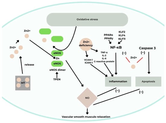 A schematic illustrating the effect of Zn on vascular endothelial function [30]. Acronyms: MT, metallothionein; eNOS, endothelial nitric oxide synthase; NO, nitric oxide; TNF-α tumor necrosis factor-alpha; NF-κB, nuclear factor-κB; TPEN, N,N,N,N-tetrakis(2-pyridylmethyl)-ethylenediamine; IL-2, interleukin 2; IL-6; interleukin 6; VCAM-1, vascular cell adhesion molecule-1; ICAM-1, intercellular adhesion molecules; PPARα, peroxisome proliferator-activated receptor alpha; PPARγ, peroxisome proliferator-activated receptor gamma; KLF2, Krüppel-like factor 2; KLF4, Krüppel-like factor 4, KLF11, Kruppel-like factor 11; Zn2+, zinc (II) ion.