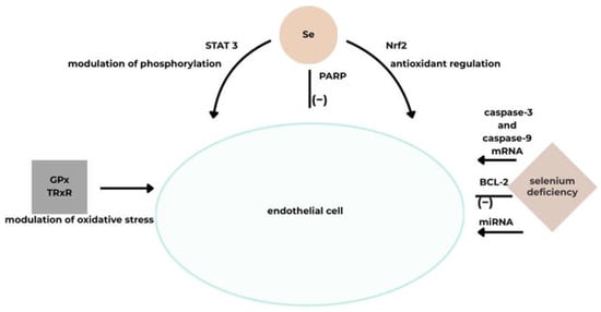 A schematic illustrating the effect of Se on vascular endothelial function [5]. Acronyms: GPx, glutathione peroxidase; TRxR, thioredoxin reductase; Nrf2, nuclear factor-erythroid 2-related factor; BCL-2, B-cell CLL/lymphoma 2; miRNA, microRNA; mRNA stands for messenger ribonucleic acid; PARP, Poly(ADP-ribose) polymerase; STAT 3, stands for Signal Transducer and Activator of Transcription 3, Se, selenium.