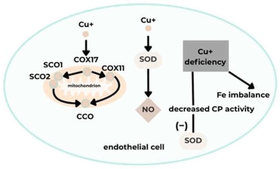 A schematic illustrating the effect of Cu on vascular endothelial function [35]. Acronyms: COX11, cytochrome c oxidase copper chaperone 11; COX17, cytochrome C oxidase copper chaperone 17; SCO1, synthesis of cytochrome C oxidase 1; SCO2, synthesis of cytochrome C oxidase 2; CCO, cytochrome C oxidase; CP, ceruloplasmin; SOD, superoxide dismutase; NO, nitric oxide; Cu+, copper (I) ion; Fe, iron.