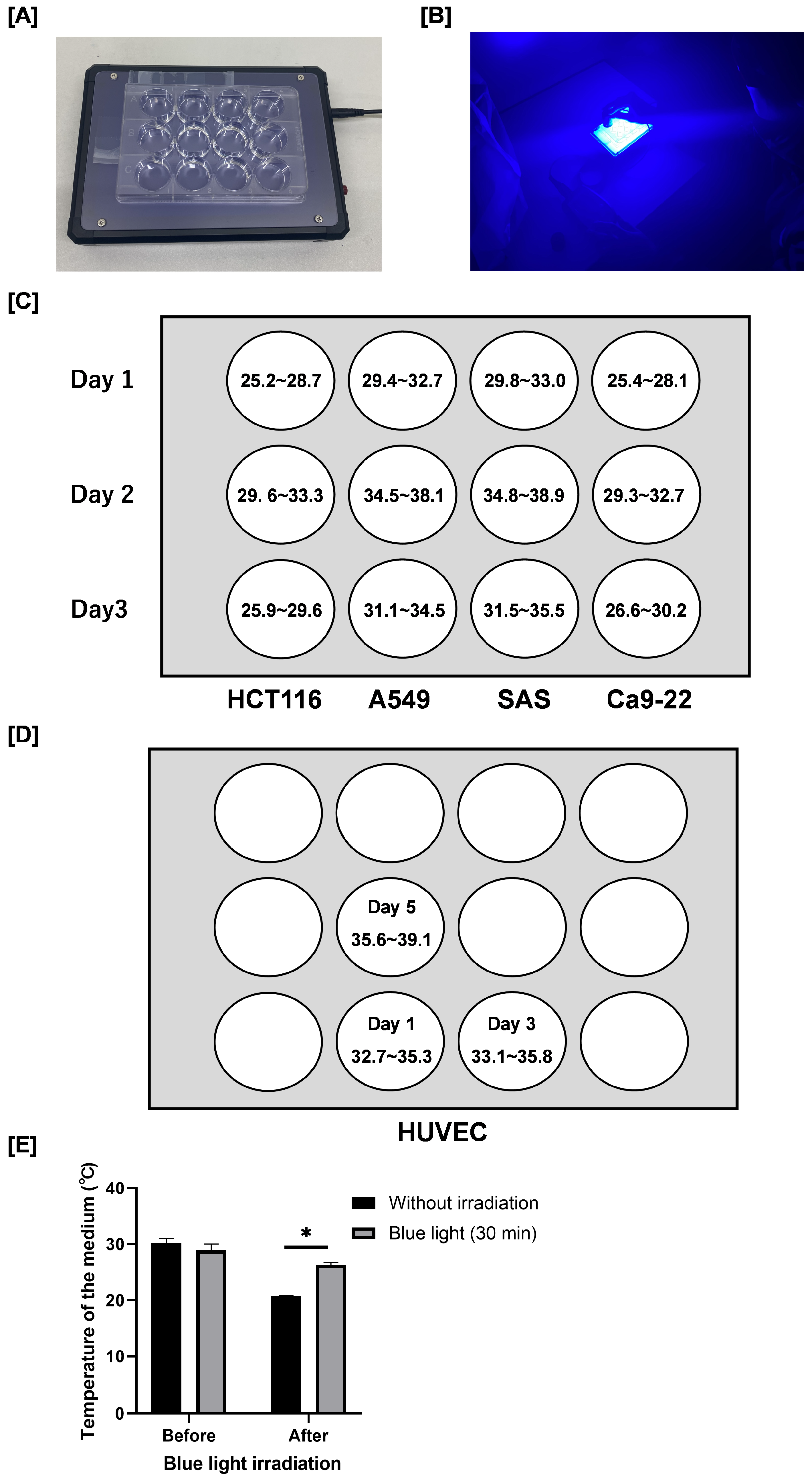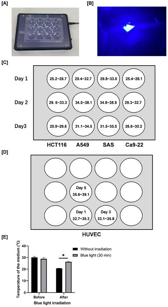 Blue light transilluminator irradiation method and the irradiance. (A) Blue light irradiation was carried out by using a blue light transilluminator (LEDB-SBOXHP) manufactured by Optocode Co. (B) Blue light irradiation. Each cancer cell was seeded into a 12-well plate as shown in the figure. (C,D) The radiation intensity [W/m2] in each well is also shown. (E) Plates containing culture medium (1.0 mL) without cells were incubated at 37 °C for 24 h. After removal from the incubator, the temperature of the medium was immediately measured using a digital thermometer. Following blue light irradiation for 30 min at room temperature, the temperature of the medium was immediately measured again. Data are presented as the mean ± standard error of three independent experiments. * p < 0.05.