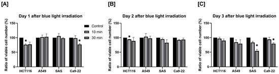 Effect of blue light irradiation on human cancer cell proliferation. Each cell was irradiated with blue light for 10 or 30 min, and the number of viable cells was determined by using the trypan blue exclusion method 1 day (A), 2 days (B), and 3 days (C) after irradiation. The results are shown as relative values to the number of viable cells in non-irradiated cells. * p < 0.05 vs. control.