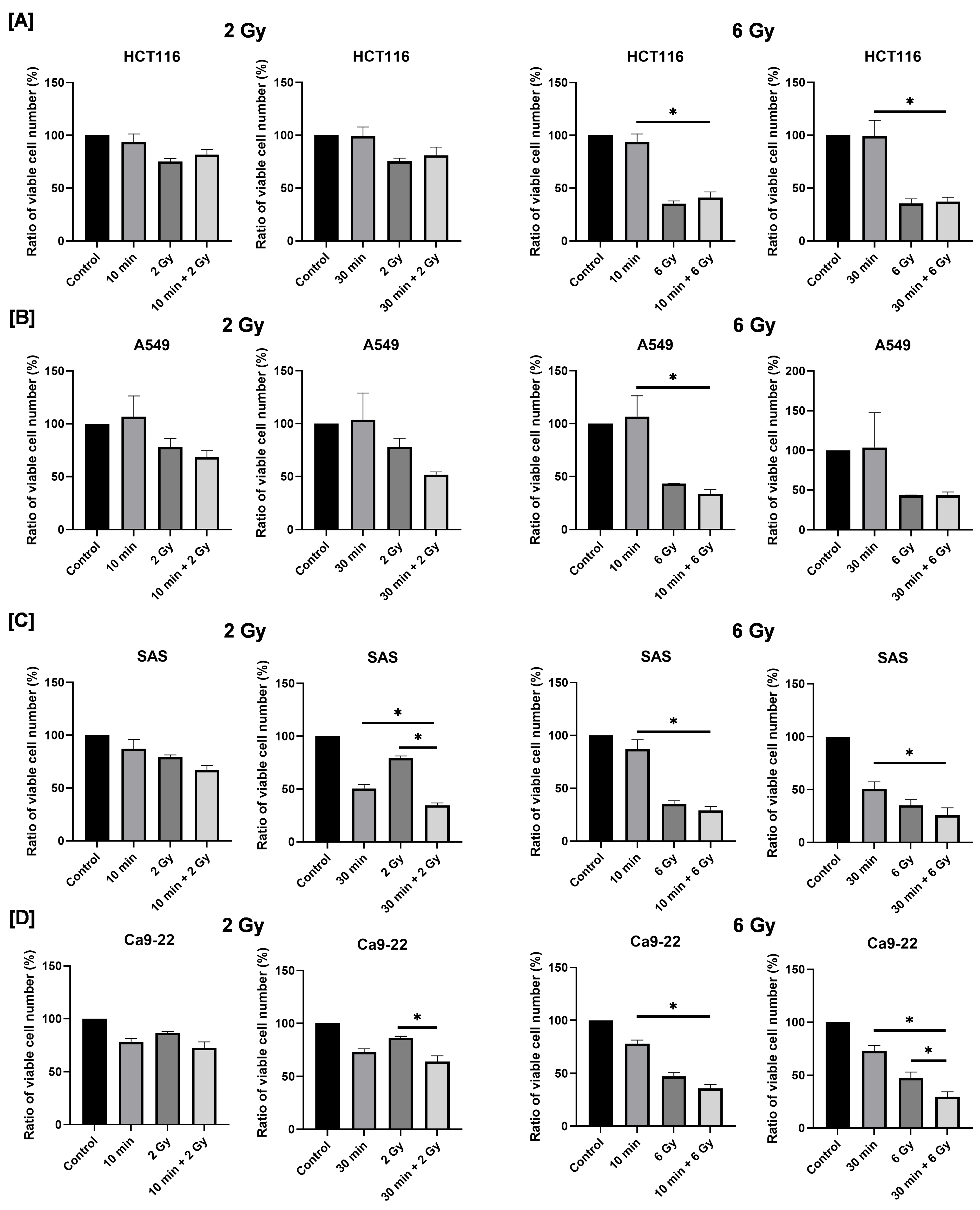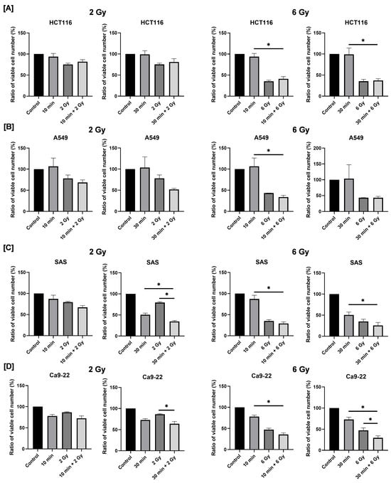 In HCT116 and A549 cells, no significant difference was observed in cell numbers between the X-ray-only group and the combined irradiation group (Figure 3A,B). In contrast, as shown in Figure 3C, combined exposure to blue light and 2 Gy X-rays resulted in a significantly lower number of viable cells compared with either treatment alone (Figure 3C). Notably, the degree of growth inhibition observed in the combined treatment group was comparable to that induced by 6 Gy irradiation alone. In Ca9-22 cells, combined treatment with blue light and 6 Gy significantly reduced the number of viable cells on day 2 post-irradiation compared with each single-treatment group (Figure 3D). These findings indicate that combined irradiation with blue light and X-ray significantly suppresses the growth of human HNSCC cells, although this effect is cell line-dependent.