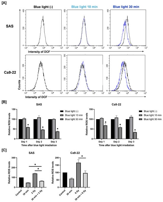 Because intracellular ROS play a key role in cellular responses such as cell death [14], we next examined whether blue light affects ROS levels in SAS and Ca9-22 cells. As shown in Figure 4A,B, blue light irradiation for 30 min reduced intracellular ROS levels at 24 h after blue light irradiation. This reduction persisted for up to 2–3 days (Figure 4B). On the contrary, 2 Gy irradiation increased ROS levels (Figure 4C). Importantly, pre-irradiation with blue light significantly suppressed the radiation-induced increase in ROS levels (Figure 4C).