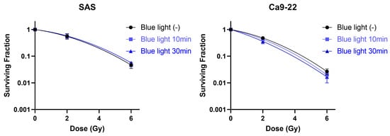 Next, we assessed whether blue light irradiation affects the intrinsic radiosensitivity of HNSCC cells using clonogenic survival assays. As shown in Figure 7, blue light irradiation did not significantly alter the clonogenic survival curves of either SAS or Ca9-22 cells following X-ray irradiation. These findings indicate that blue light does not enhance radiosensitivity per se and that the observed antiproliferative effects are independent of classical radiosensitization mechanisms.