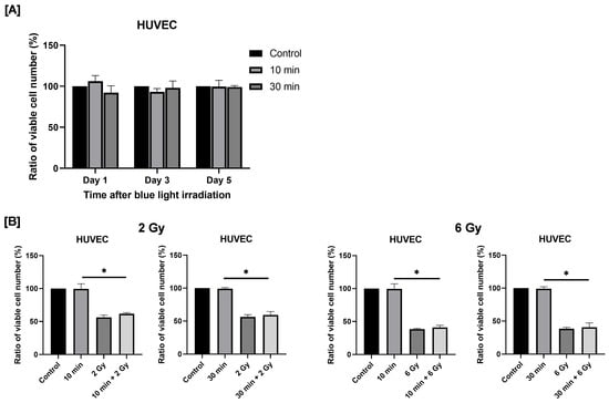 Effects of blue light irradiation and combined exposure to blue light and X-rays on HUVECs proliferation. (A) Each cell was irradiated with blue light for 10 or 30 min, and the number of viable cells was determined by using the trypan blue exclusion method 1 to 5 days after irradiation. The results are shown as relative values to the number of viable cells in non-irradiated cells. (B) HUVECs were irradiated with blue light were irradiated 24 h following blue light irradiation. The number of viable cells was counted 4 days after X-ray irradiation. The results are shown as relative values to the number of viable cells of the non-irradiated cells with blue light and X-rays. * p < 0.05.