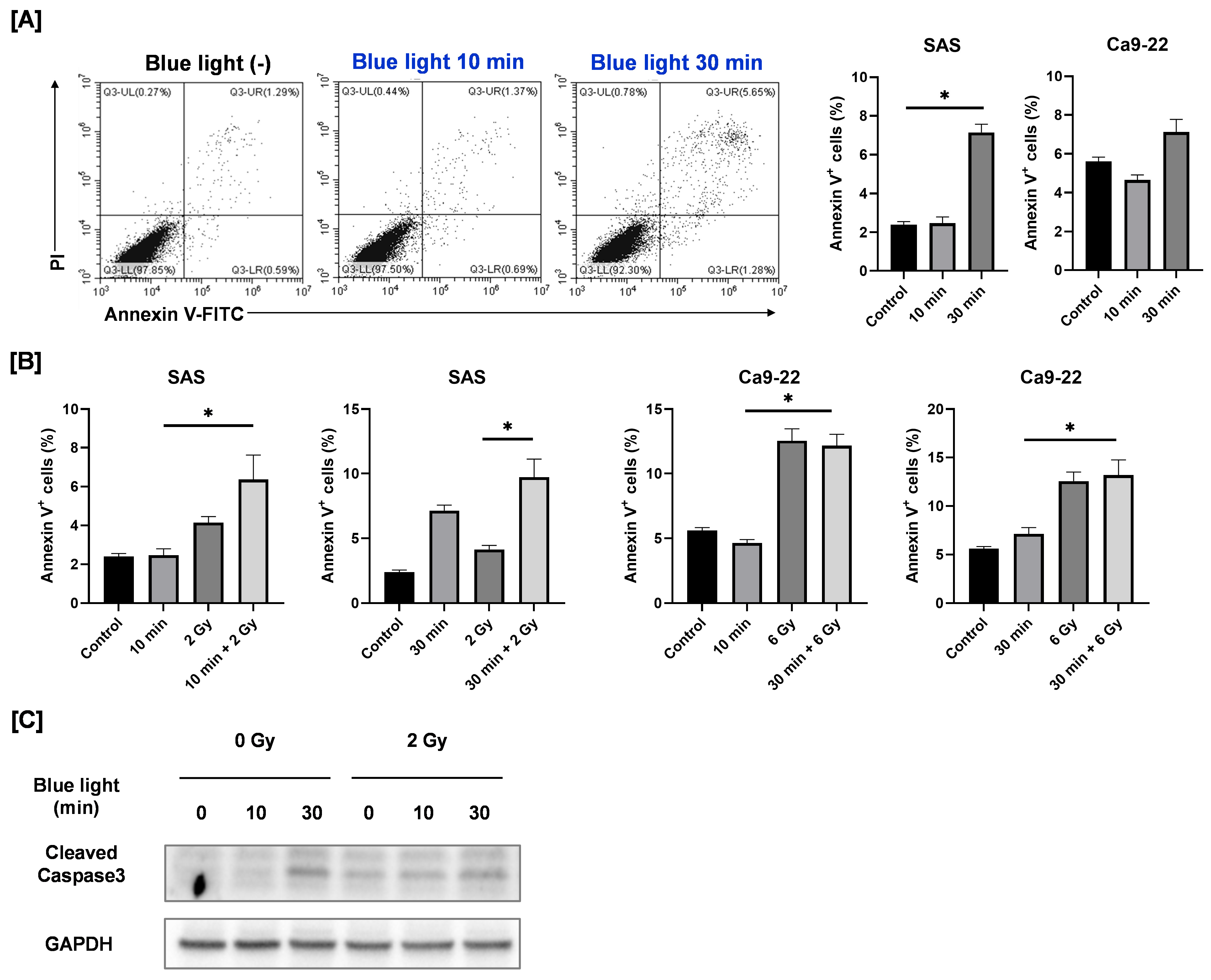 In SAS cells, exposure to blue light for 30 min significantly increased the proportion of Annexin V–positive apoptotic cells (Figure 6A). In the combined treatment group, the percentage of apoptotic cells following 30 min of blue light plus 2 Gy irradiation was higher than that observed after 2 Gy irradiation alone; however, no significant difference was detected between the combined treatment and blue light alone. Consistently, blue light irradiation increased the expression of cleaved caspase-3, a proteolytic enzyme that executes apoptosis [17], whereas its expression in the combined treatment group was comparable to that in the blue light–only group (Figure 6C). In contrast, blue light irradiation did not induce apoptosis in Ca9-22 cells, and the apoptotic response to combined irradiation was similar to that observed following 6 Gy irradiation alone (Figure 6A,B).