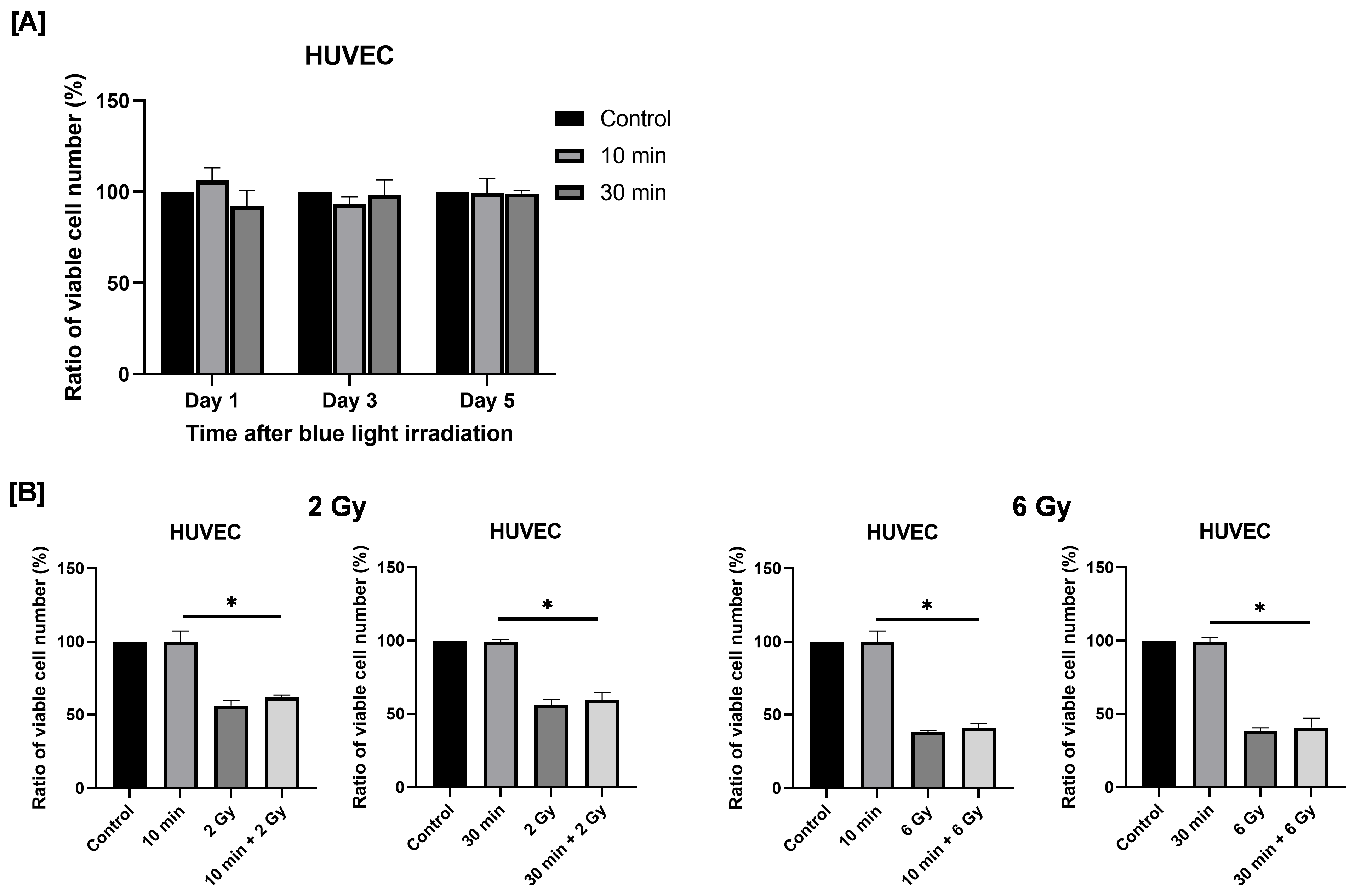 Next, we examined the effects of combined exposure to blue light and ionizing radiation on HUVEC proliferation. Irradiation with 2 or 6 Gy X-rays significantly reduced the number of viable HUVECs. Combined exposure to blue light and 2 Gy X-ray irradiation resulted in a greater reduction in viable cell numbers compared with blue light irradiation alone (Figure 8B). A similar tendency was observed following combined exposure to blue light and 6 Gy irradiation (Figure 8B).