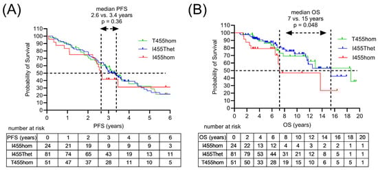 Survival outcomes of MM patients following HDCT/ASCT according to the LAG3 genotype. (A) Progression-free survival (PFS) according to LAG3 gene polymorphism rs870849 encoding LAG3 I455hom, I455Thet or T455hom. (B) Overall survival (OS) in the genetic subgroups LAG3 I455hom, I455Thet and T455hom.