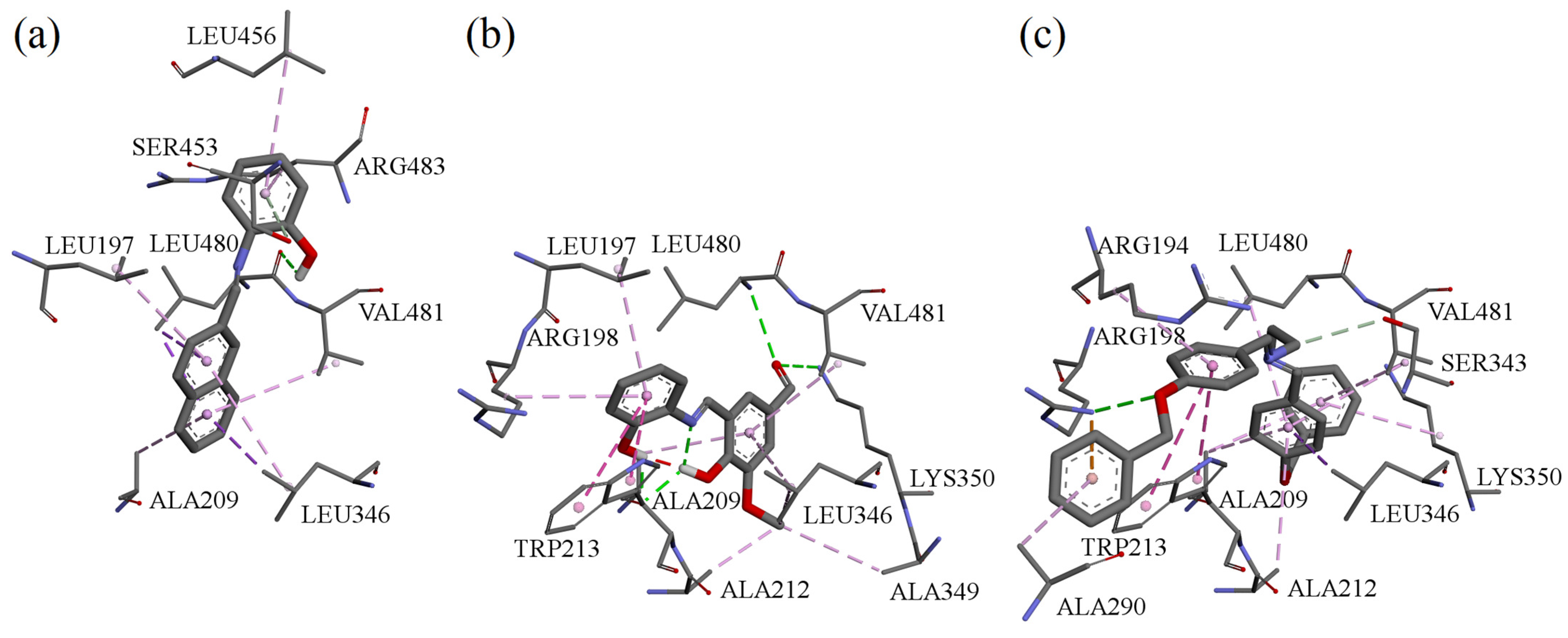 3.8. Molecular Docking of Compounds A, B, and F to Bovine Serum Albumin