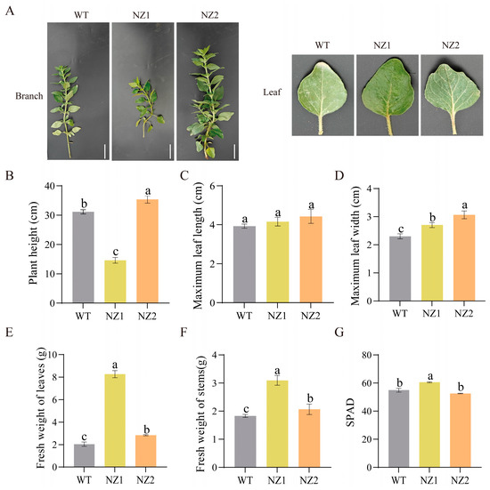 Effect of 12C6+ heavy iron irradiation on growth characteristics of oregano. (A) Phenotypes of branch and leaves in oregano mutants NZ1 (middle), NZ2 (right), and WT (left); (B–G) plant height, maximum leaf length, maximum leaf width, fresh weight of leaves, fresh weight of stems, and SPAD. Bar = 5 cm. Different letters indicate significant differences between groups at p < 0.05 according to Duncan’s multiple range test.
