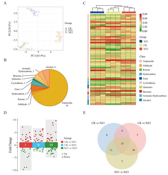 Metabolite analysis of volatile compounds in heavy-ion-induced oregano mutants (NZ1, NZ2) and the wild-type plant. (A) Principal component analysis (PCA) of all 9 samples. (B) Classification and proportion of VOCs detected in the oregano leaves. (C) Heatmap analysis of all VOCs in three plants. (D) Volcano plots of DAVs in various comparison groups. (E) Venn diagram of DAVs.