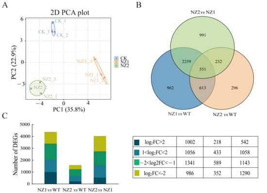 Characterization of DEGs in oregano NZ1, NZ2 and WT. (A) PCA of 9 samples. (B) Venn diagram of DEGs. (C) Statistics of DEGs in NZ1, NZ2, and WT.