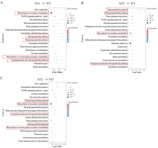 KEGG enrichment of DEGs in NZ1 vs. WT (A), NZ2 vs. WT (B), and NZ2 vs. NZ1 (C), respectively.