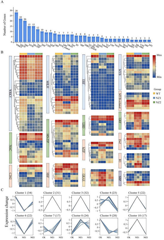 Differential expression analysis of transcription factors in NZ1, NZ2, and WT. (A) Statistical analysis of transcription factors in DEGs. (B) Heat map of expression levels of 16 transcription factor families. (C) K-means clustering analysis of 250 differential expression of transcription factors.