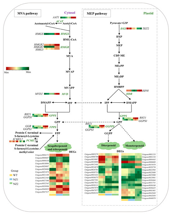 Profiles of genes encoding enzymes involved in terpenoids biosynthesis. The left and right showed the MVA and MEP pathways in oregano, respectively. Key enzymes in DEGs include acetyl-CoA C-acetyltransferase (AACT), hydroxymethylglutaryl-CoA synthase (HMGS), hydroxymethylglutaryl-CoA reductase (HMGR), mevalonate-5-diphosphate decarboxylase (MVD), geranyl pyrophosphate synthase (GPPS), farnesyl pyrophosphate synthase (FPPS), 1-deoxy-D-xylulose-5-phosphate synthase (DXS), and geranylgeranyl pyrophosphate synthase (GGPPS). The color scale from green to red represents the abundance of DEGs ranging from low to high levels in WT, NZ1, and NZ2.