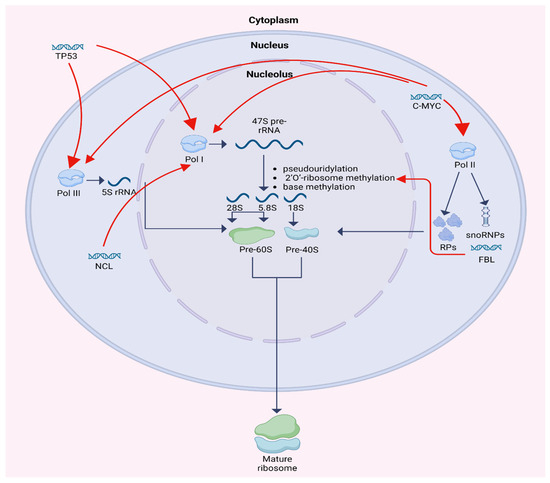 Schematic diagram of ribosome biogenesis and its regulation by TP53, C-MYC, FBL, and NCL. Created in BioRender. Horochowska, M. (2026) https://BioRender.com/8f0jeli (accessed in 10 January 2026).