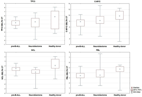 Relative expression of TP53, C-MYC, NCL, and FBL in pre-B ALL, neuroblastoma, and healthy patients.