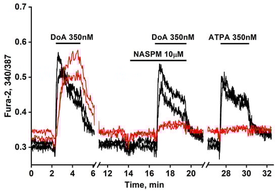 Dynamic of [Ca2+]i changes in two GABAergic neurons expressing CP-AMPARs (red curves) and in two expressing CP-KARs (black curves). Both subtypes respond to domoic acid (DoA) (350 nM). In one of the subtypes responding more slowly to DoA, the response is inhibited by NASPM (10 μM), while the other, responding more quickly, is activated by ATPA (350 nM). N = 125, n = 3.