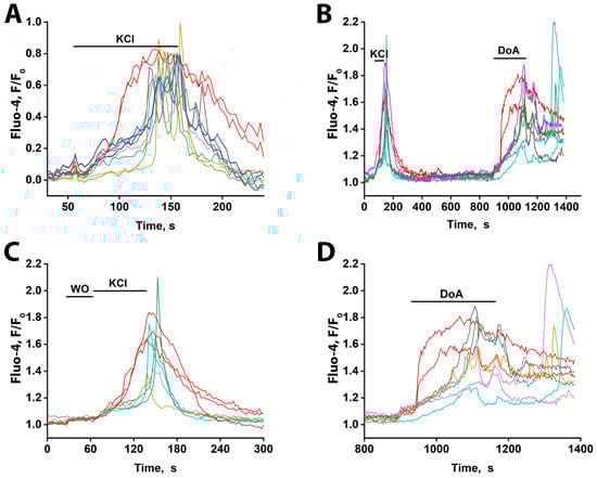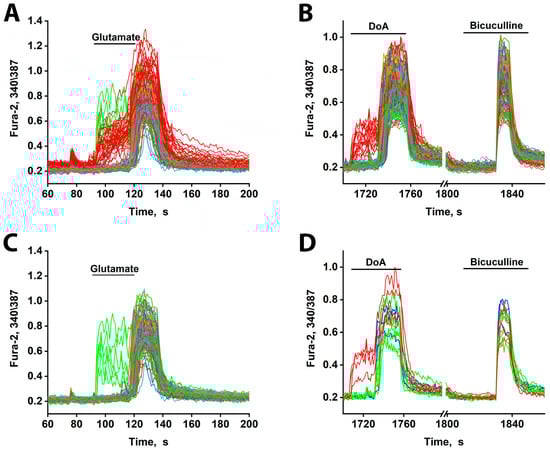 Changes in [Ca2+]i in neurons in response to DoA. (A) Effect of DoA (100 nM) in the presence of the AMPA receptor inhibitor, 2 µM NBQX. An early response of GABAergic neurons expressing CP-KARs (red curves) is shown. Glutamatergic neurons (gray–blue–green curves) respond with a delay of 80 s. (B) Change in [Ca2+]i in neurons in response to 100 nM DoA in the presence of 10 µM bicuculline. (C) When the DoA concentration is increased to 500 nM, the delay in the response of glutamatergic neurons (gray–blue–green curves) decreases from 80 s to 20 s. (D) Bicuculline (10 µM) completely negates the delay in the case of a high concentration of DoA (500 nM). N = 200 n = 3.