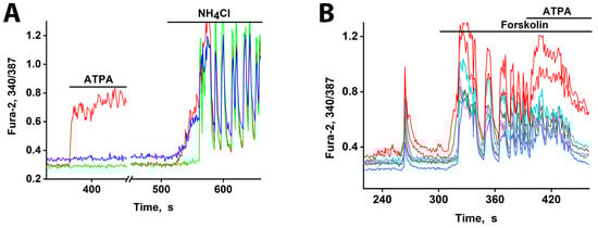 The following reagents were used: domoic acid, NASPM trihydrochloride, ATPA, NBQX, forskolin (Tocris Bioscience, Bristol, UK), bicuculline (Cayman Chemical, Ann Arbor, MI, USA), L-Glutamic acid (Sigma-Aldrich, Saint Louis, MO, USA), NH4Cl (AppliChem, Darmstadt, Germany), Fura-2 AM (Molecular Probes, Eugene, OR, USA), Neurobasal-A medium (Life Technologies, Grand Island, NY, USA), B-27 supplement (Life Technologies, Grand Island, NY, USA), and Trypsin 2.5% (Life Technologies, Grand Island, NY, USA). Statistical and data analysis ImageJ software (National Institutes of Health, Bethesda, MD, USA) was used for image analysis. The results are presented as single-cell signals or the average cell signal per the field of view ± standard error (SE). Origin Pro 2021 version 9.8.0.200 was used for graph creation and analysis (OriginLab, Northampton, MA, USA). Electrophysiological data were analyzed using ClampFit 10 software (Molecular Devices, San Jose, CA, USA). All experiments were performed using the cultures from at least 2 to 3 different animals. The percentage of neurons that responded to ATPA in the field of view varied from 5% to 15%.