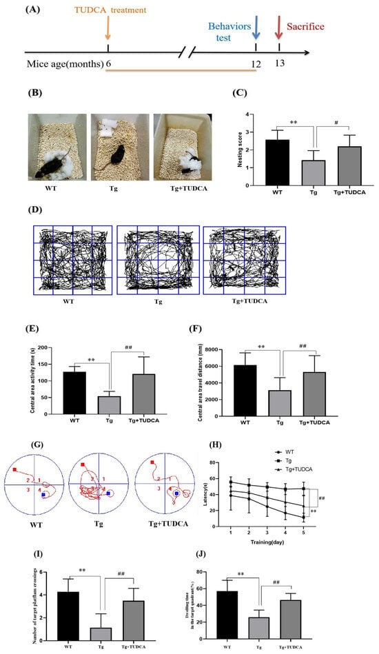 Effects of TUDCA on Tg mice’s cognitive deficits. (A) Treatment timeline for Tg mice with TUDCA, the orange line indicates that TUDCA treatment was administered during this period. (B) Photographs representing three groups of nesting. (C) Scores of nesting. (D) Representative pictures of mice in the open field. (E) Central area activity time. (F) Central area travel distance in OFT. (G) The representative locus diagram during the Morris water maze experiment, 1–4 represents the 1st - 4th quadrants, the red square indicates the starting point for the mouse’s releas, the blue square indicates the platform position, the red curve represents the movement route of the mouse. (H) The time it takes to escape in the Morris water maze test. (I) The count of intersections in the desired quadrant. (J) The percentage of time spent in the target quadrant was calculated by dividing the time spent in the target quadrant by the total time. Data are mean ± SEM. ** p < 0.01 vs. WT group, # p < 0.05, ## p < 0.01 vs. Tg group.